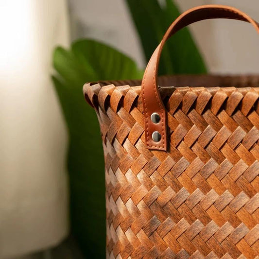 SKY-TOUCH Rectangular Rattan Storage Basket with Handle,Strong and Durable Hand-Woven Rattan Basket for Organizing,Storage and Organizer Baskets,38 28 24cm, Coffee Color