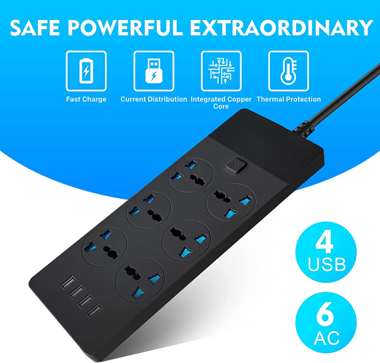 سلك تمديد شرائح الطاقة SKY-TOUCH 6 منافذ، محول قابس عالمي مع 4 منافذ USB لحماية التيار، مقبس شحن مع سلك تمديد جريء 2 متر (أسود)