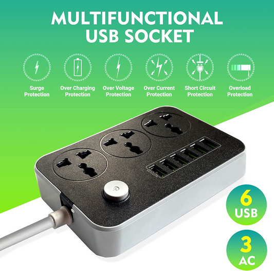 سلك تمديد شرائط الطاقة SKY-TOUCH 3 منافذ، مقبس طاقة مع 6 منافذ USB مقبس شحن عالمي مع سلك تمديد جريء 2 متر
