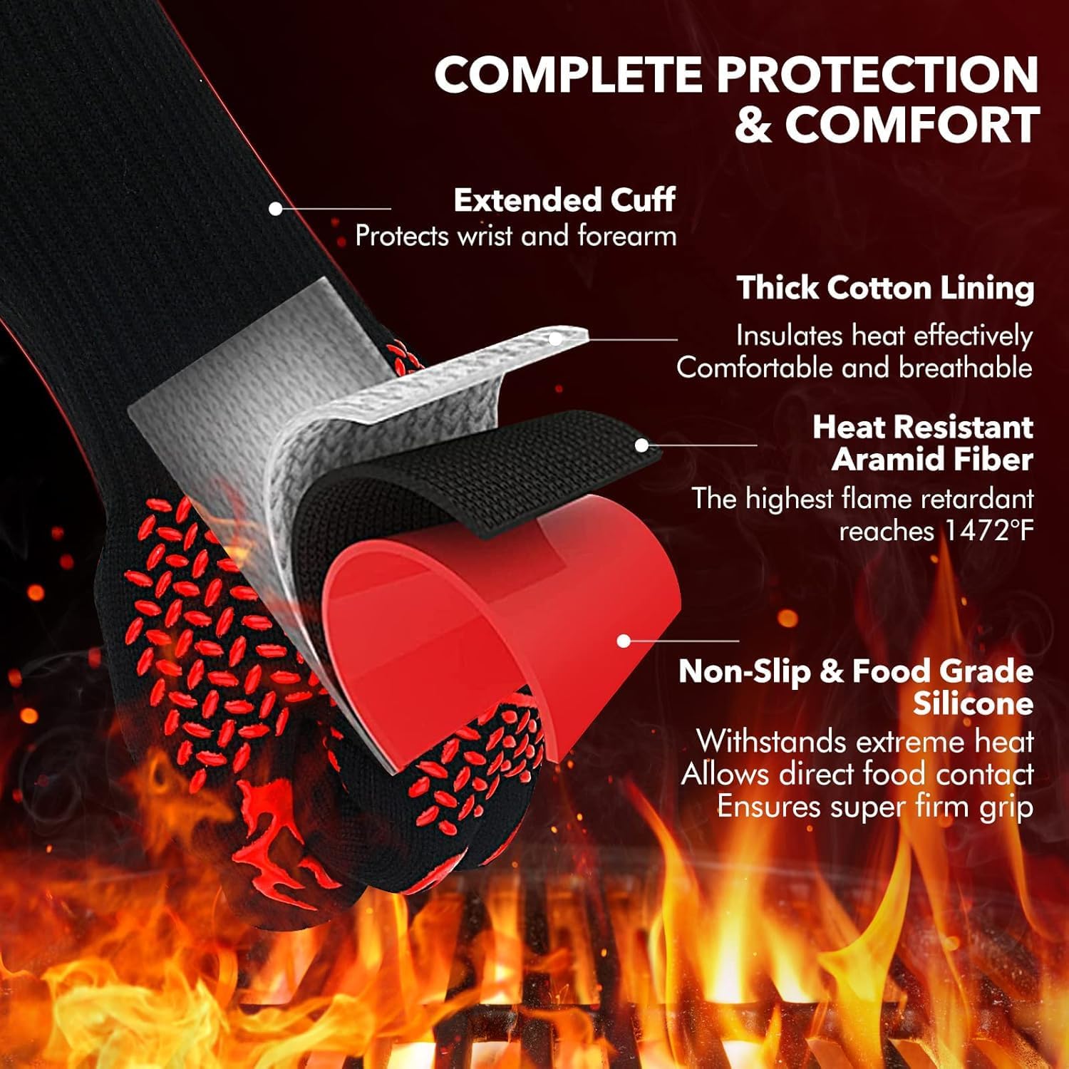 - Triple Heat-resisting BBQ Gloves - This 1472℉ oven gloves feature 3 layers of special resistant construction. The outermost layer of BBQ gloves is food-grade silicone, which has a skid resistance effect. The middle layer is a high resistant aramid fiber, which blocks the direct entry of high temperature, and the inside is thick cotton lining. This grill gloves heat proof for men is resistant to highest temperature up to 1472℉ and can be directly exposed to an open flame for 5-8s.