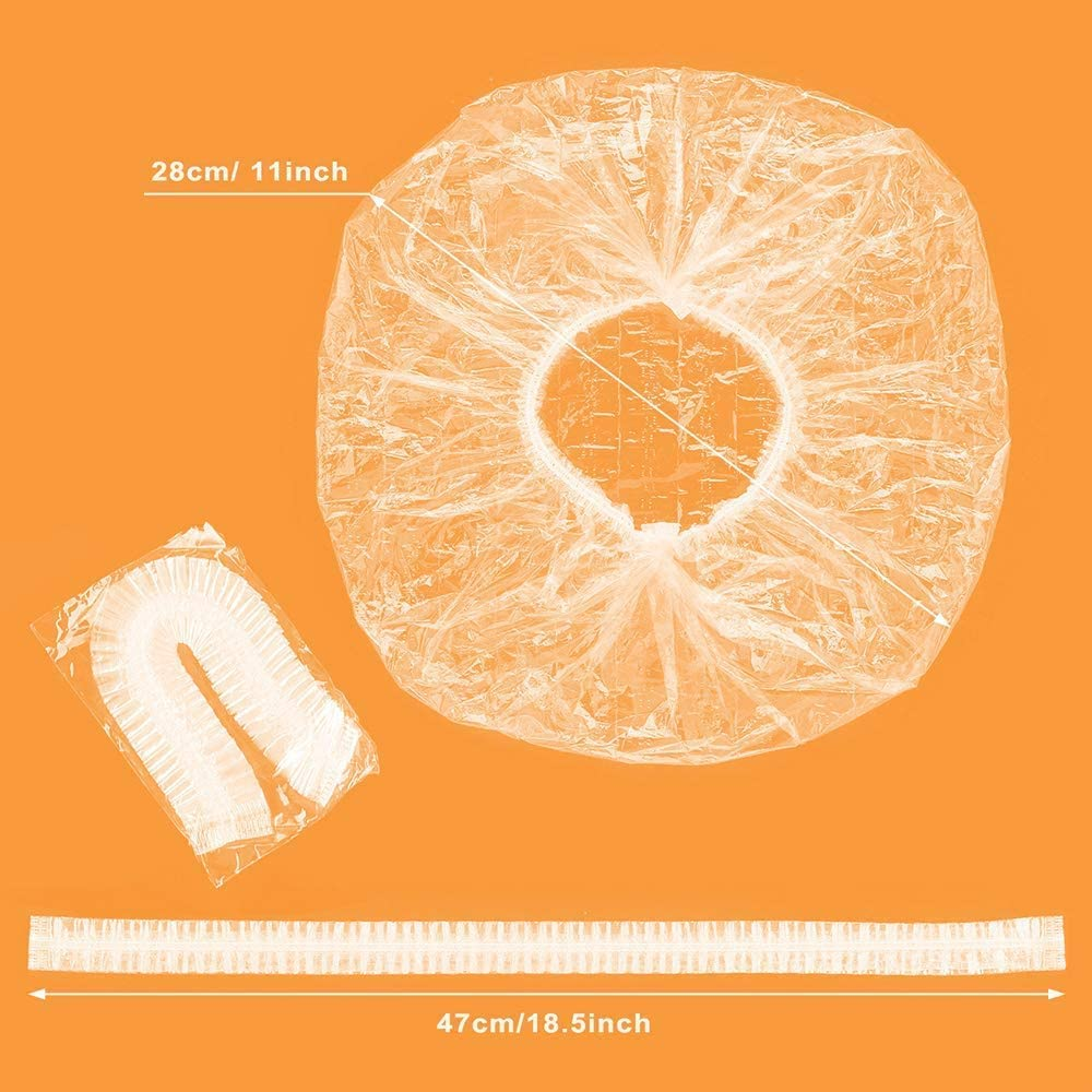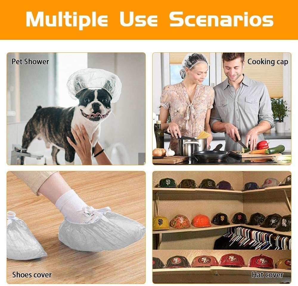 - متعددة الاستخدامات: قبعات الدش الخاصة بنا متعددة الاستخدامات للغاية. باستثناء الاستحمام والأعمال المنزلية وصالون الشعر. كما يمكن استخدامه كغطاء للأحذية، وغطاء للقبعة، وحقيبة سفر للأحذية، وحقيبة فضلات الكلاب، وحقيبة مبللة، وحقيبة أنابيب، وحقيبة كاميرا، إلخ.