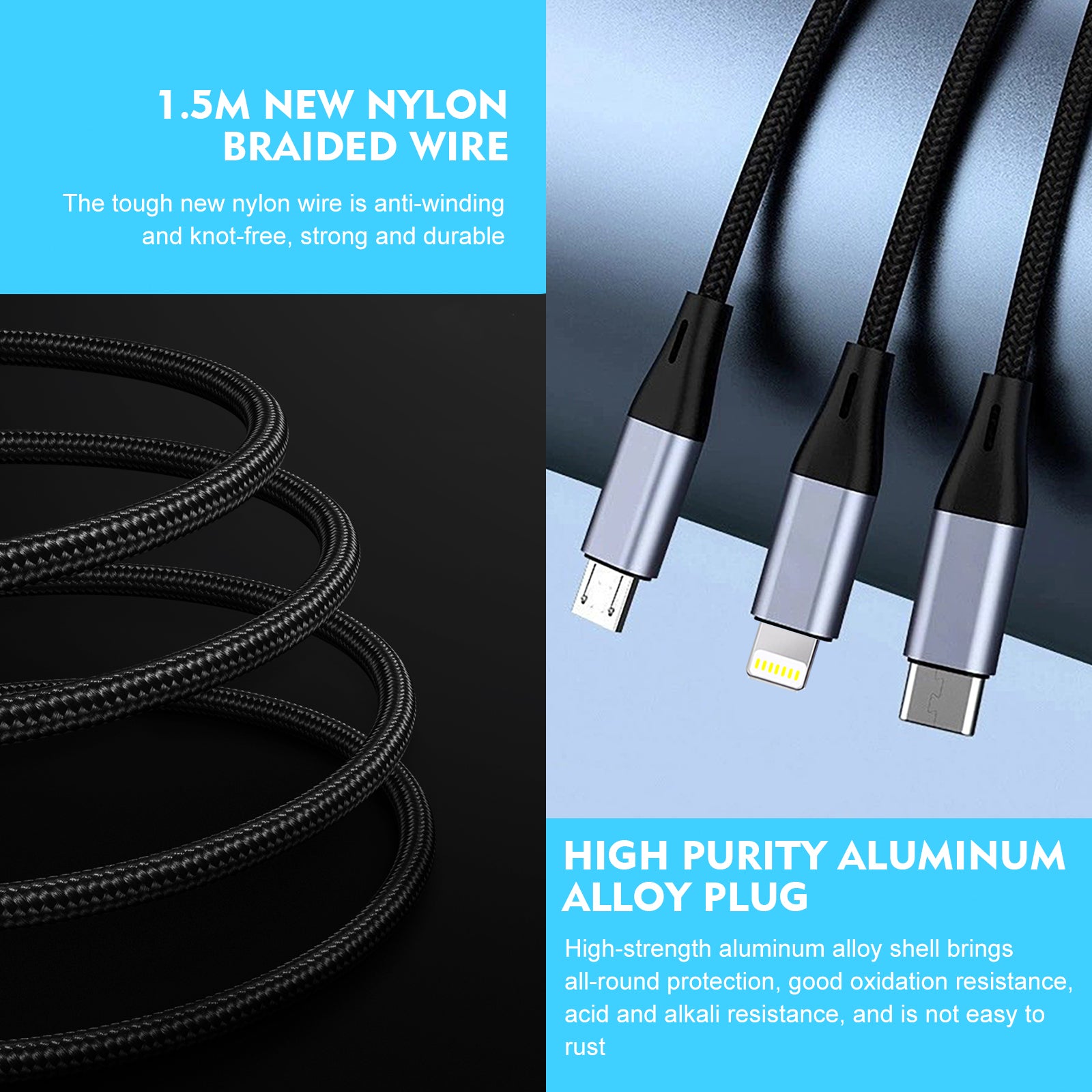 كابلات شاحن هاتف USB 3 في 1 من SKY-TOUCH، كابل شحن غير قابل للكسر من النايلون المضفر السريع 5 أمبير، سلك شحن عالمي متعدد المنافذ مع موصل USB C/Micro USB/IOS للهواتف