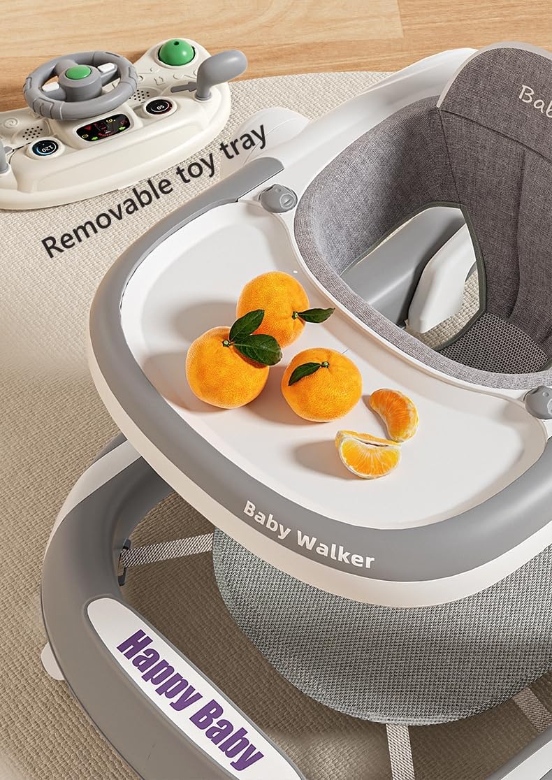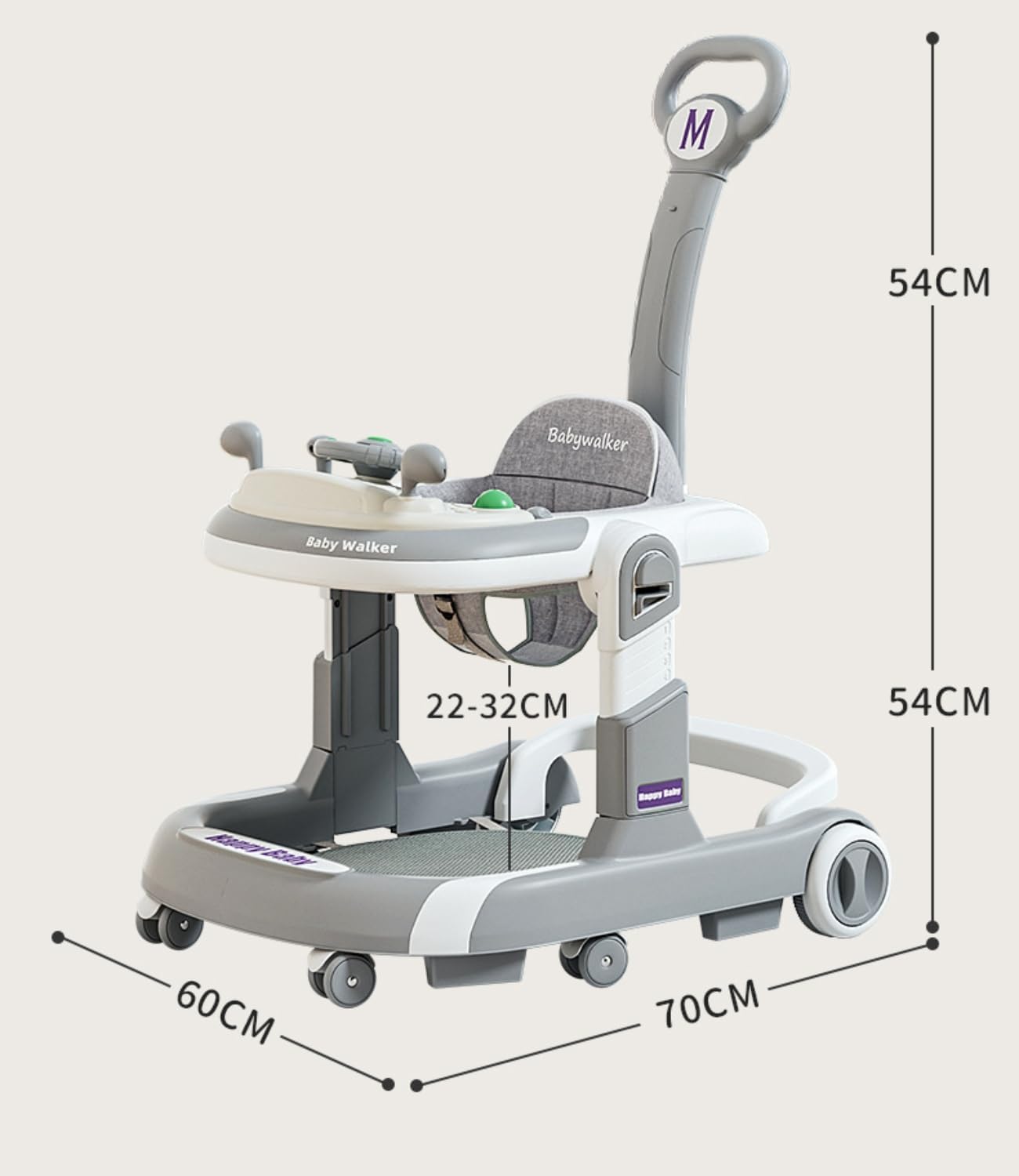 - 4 modes baby walker: (1)Learn to sit mode, Designed to train babies to sit, in preparation for their first attempt to walk. (2) Assisted walking mode: baby can exercise the sense of direction and limb muscles by pushing the baby walker. (3) putter mode: The mother can gently push the baby behind, and enjoying outdoor parent-child time.(4) Feeding chair mode: baby walker equipped with detachable dinner plate, convenient for mother to feed the baby