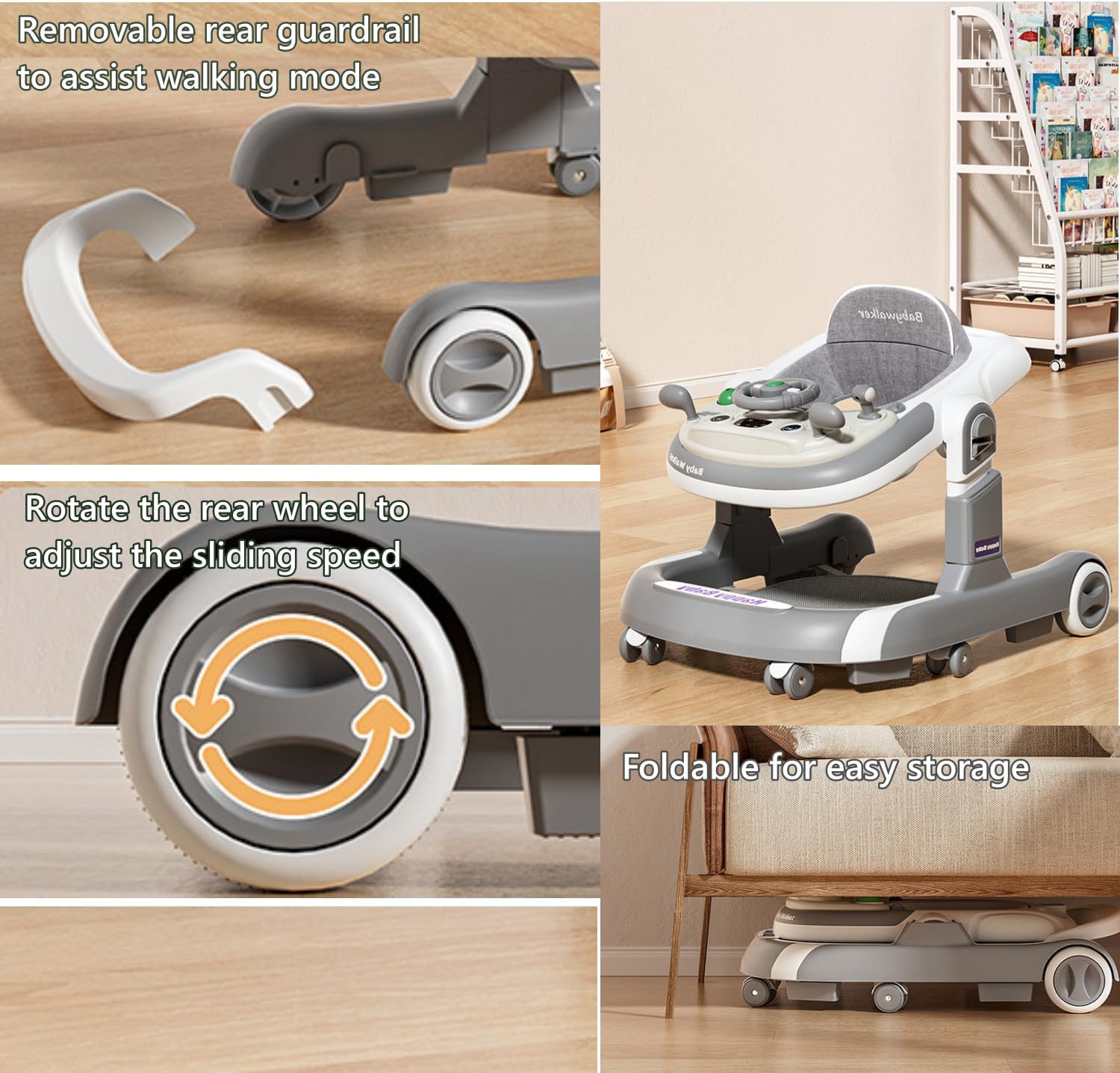 - Baby Walker: Baby walker can be easily converted from a seated one into a walk-behind walker, The separate music box mode can provide entertainment for the baby. The enlarged base prevents rollover and accidental collision when sliding backward. An optional baby walker can balance the force on both feet and effectively avoid bowed legs.
