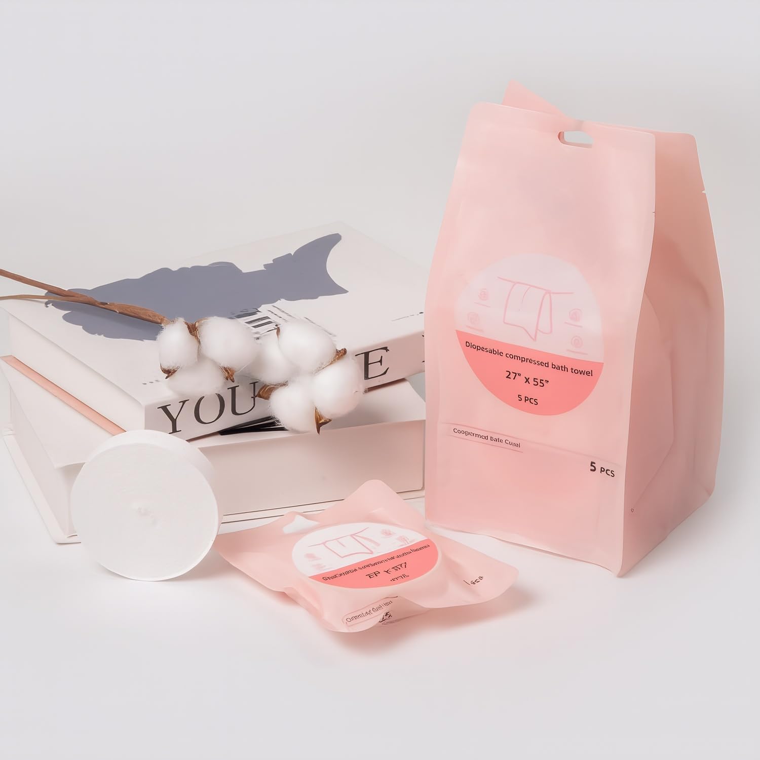 SKY-TOUCH 5Pcs Large Compressed Disposable Bath Towels, 70x140cm Portable Single-Use Towels, Soft and Absorbent Travel Towels for Camping, Hotel, Beach, Gym, and Outdoor Use(Pink)