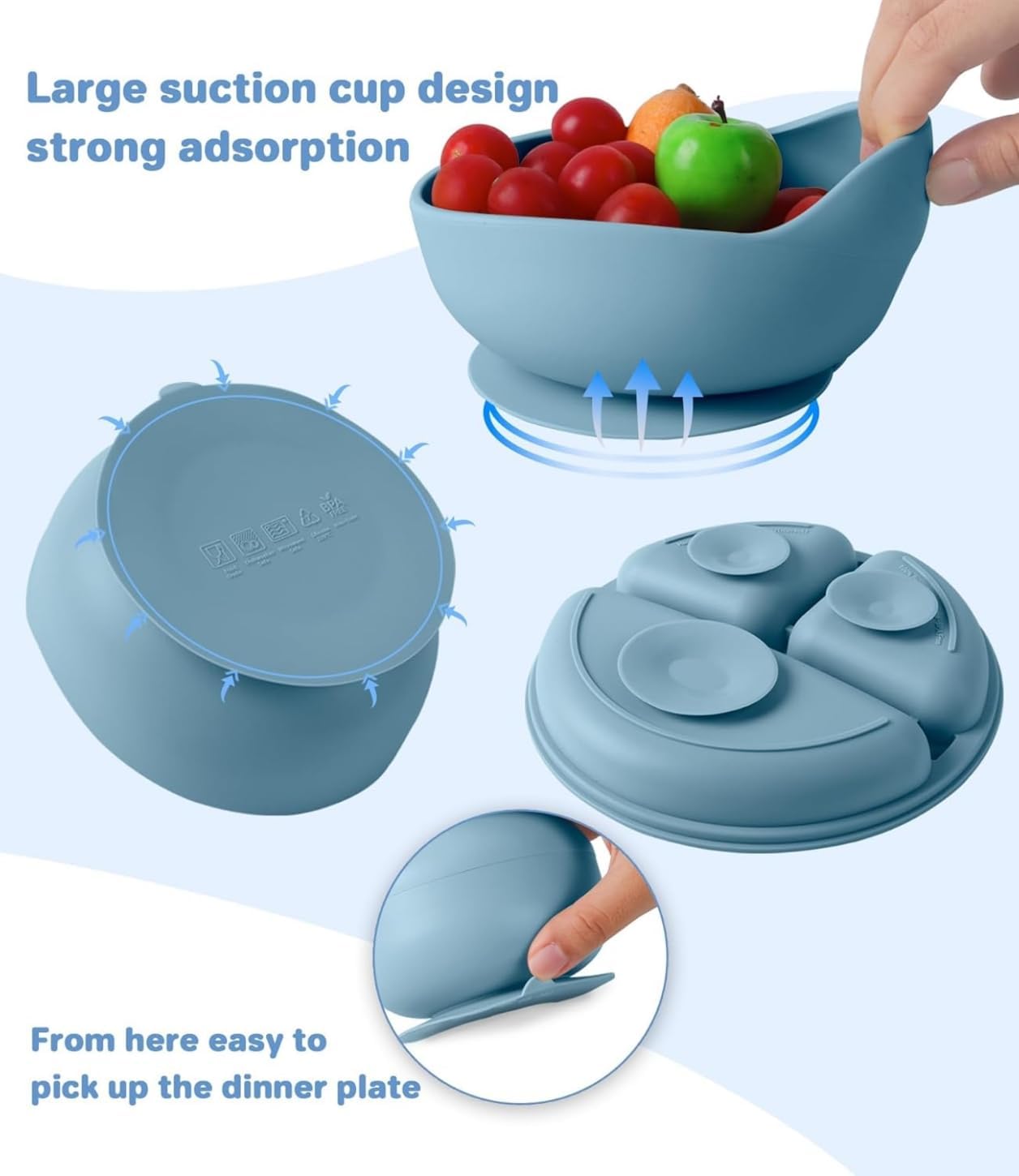 - STRONG SUCTION DESIGN, PREVENTS TIPPING: Our baby plates and bowls set adopted a large suction base, which sticks firmly on smooth surfaces including high-chair trays and can effectively avoid the baby take it off. Divided plate design can serve different foods. Let your baby start to learn self feeding without worrying about them making a mess on the floor or dropping their plates & bowls.