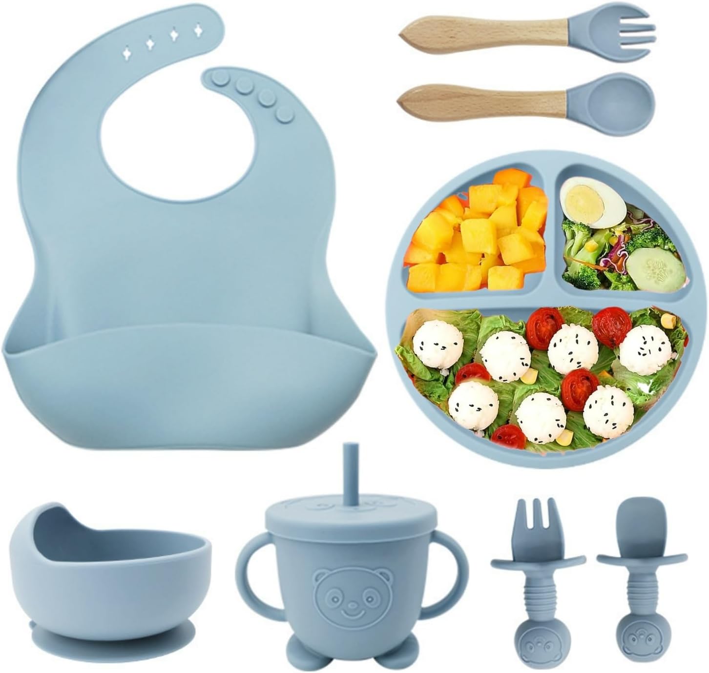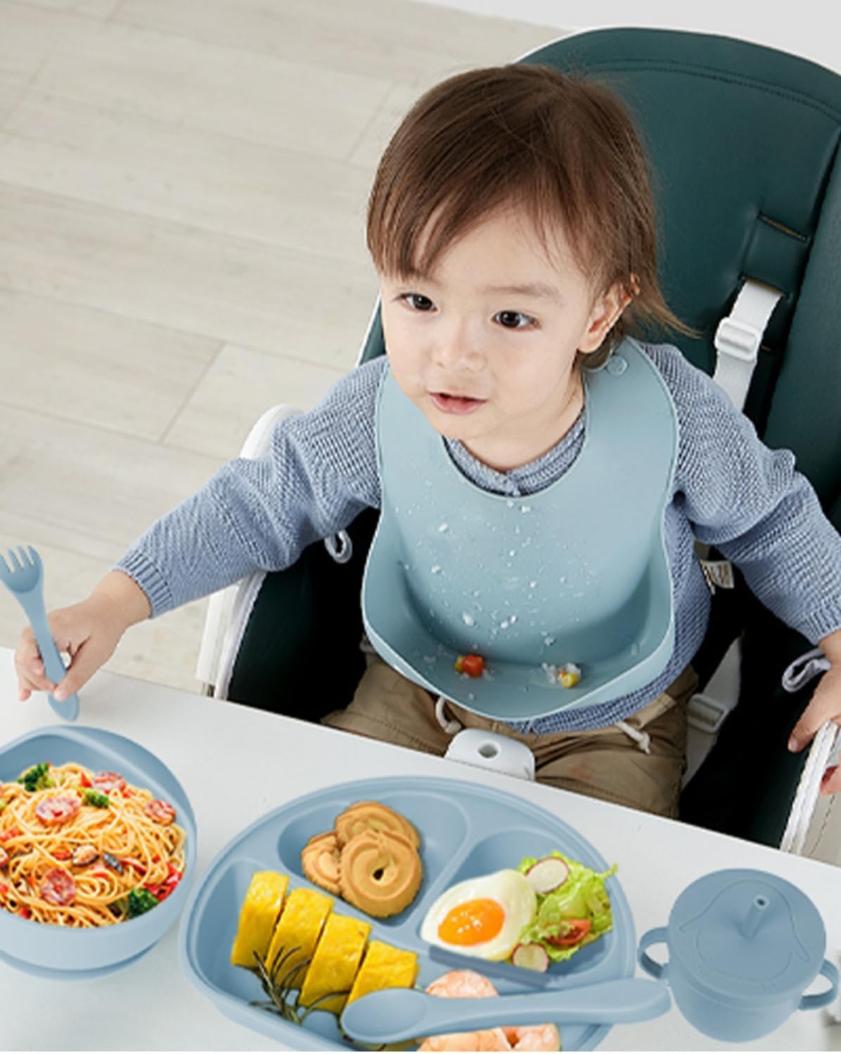 - SILICONE BABY FEEDING SET: You'll get 1 x adjustable bibs with food catcher, 1 suction divided plate, 1 suction bowl, 1 training straw sippy cup, 2 x spoon and 2 x fork. We adopted food grade silicone which is free of BPA, PVC, and Phthalate. Perfect for the first stage of baby led weaning, help your baby transition to self feeding in a better, cleaner, safer way.