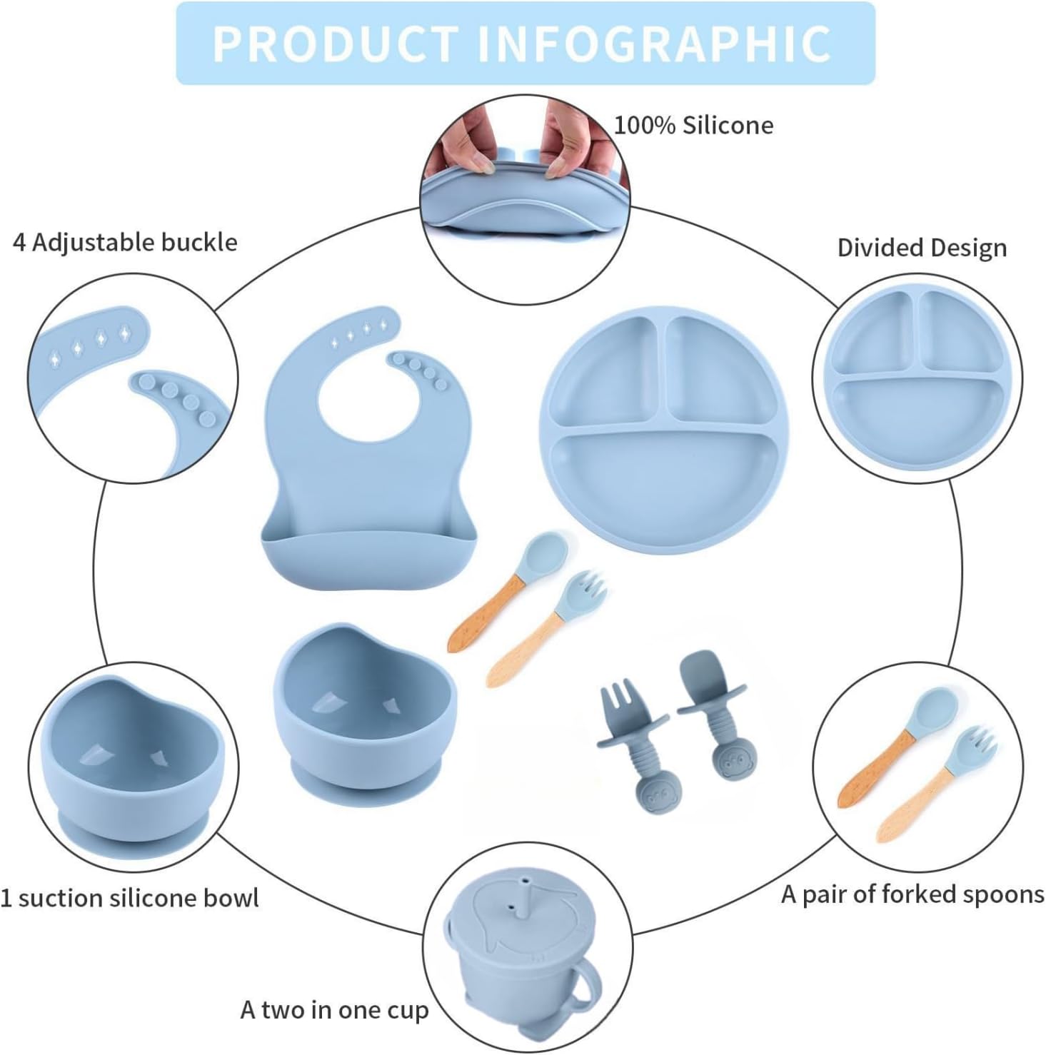 SKY-TOUCH 8 Pcs Silicone Baby Feeding Set, Baby Led Weaning Supplies with Suction Bowl Divided Plate, Self Feeding Spoons Forks Sippy Cup Adjustable Bib, for 6+ Months (Blue)