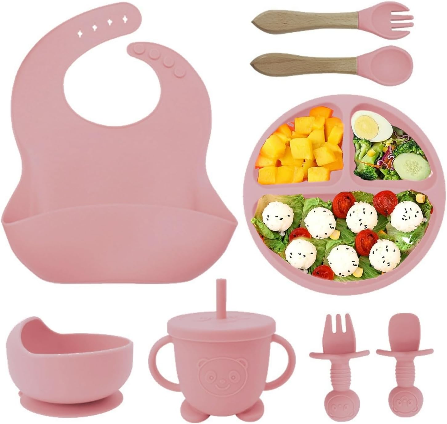 SKY-TOUCH 8 Pcs Silicone Baby Feeding Set, Baby Led Weaning Supplies with Suction Bowl Divided Plate, Self Feeding Spoons Forks Sippy Cup Adjustable Bib, for 6+ Months (Pink)