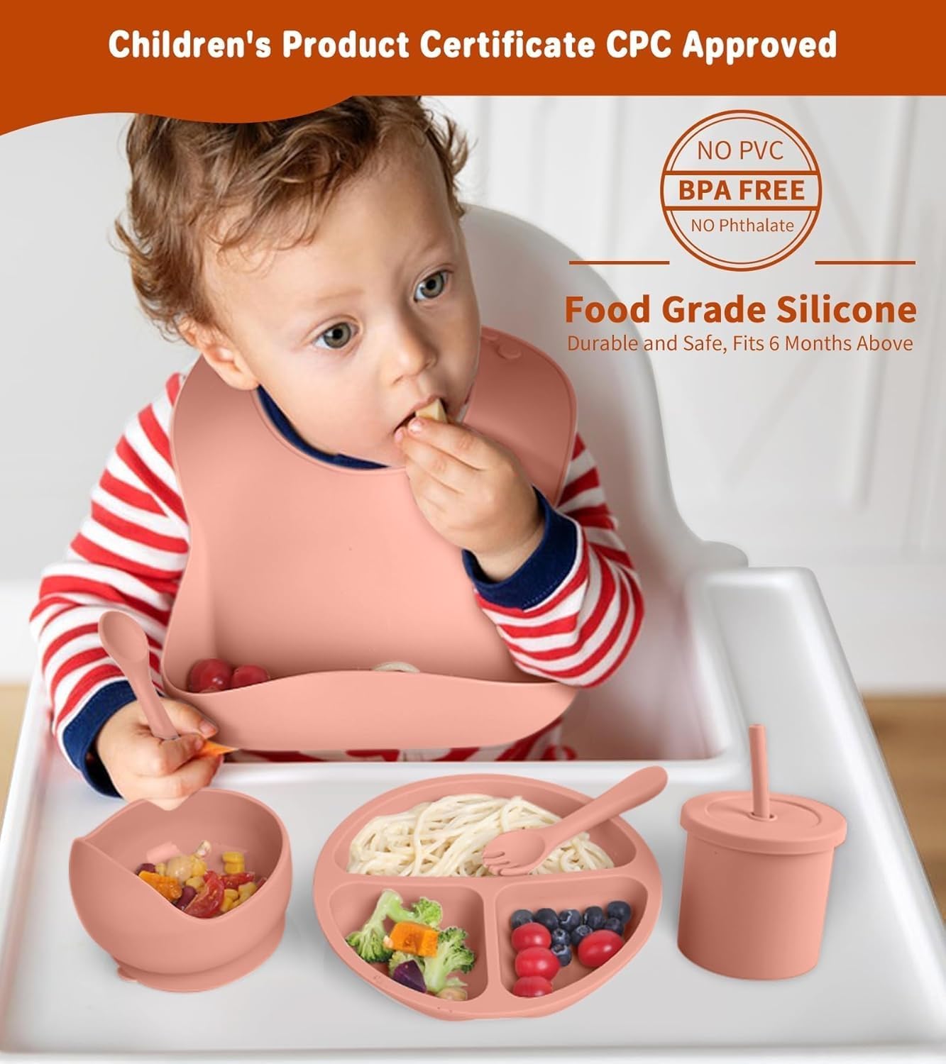 - SILICONE BABY FEEDING SET: You'll get 1 x adjustable bibs with food catcher, 1 suction divided plate, 1 suction bowl, 1 training straw sippy cup, 2 x spoon and 2 x fork. We adopted food grade silicone which is free of BPA, PVC, and Phthalate. Perfect for the first stage of baby led weaning, help your baby transition to self feeding in a better, cleaner, safer way.