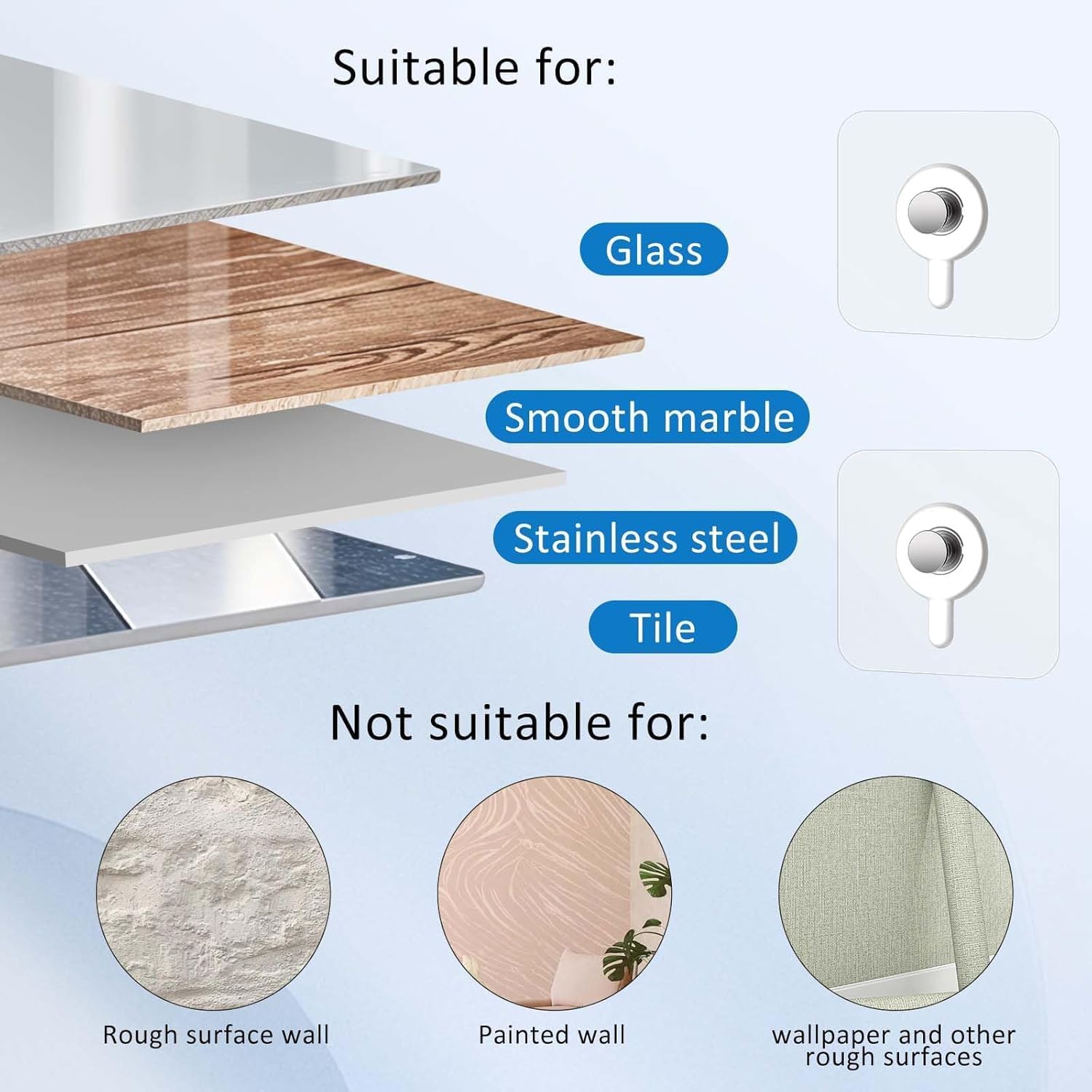 - Multi-Surface Versatility: Stick effortlessly on tiles, glass, metal, or smooth wood! These self-adhesive hooks resist peeling even in humid environments. Ideal for shower accessories, kitchen tools, or photo frames. Avoid painted walls/wallpapers. Remove cleanly with a hairdryer – no residue