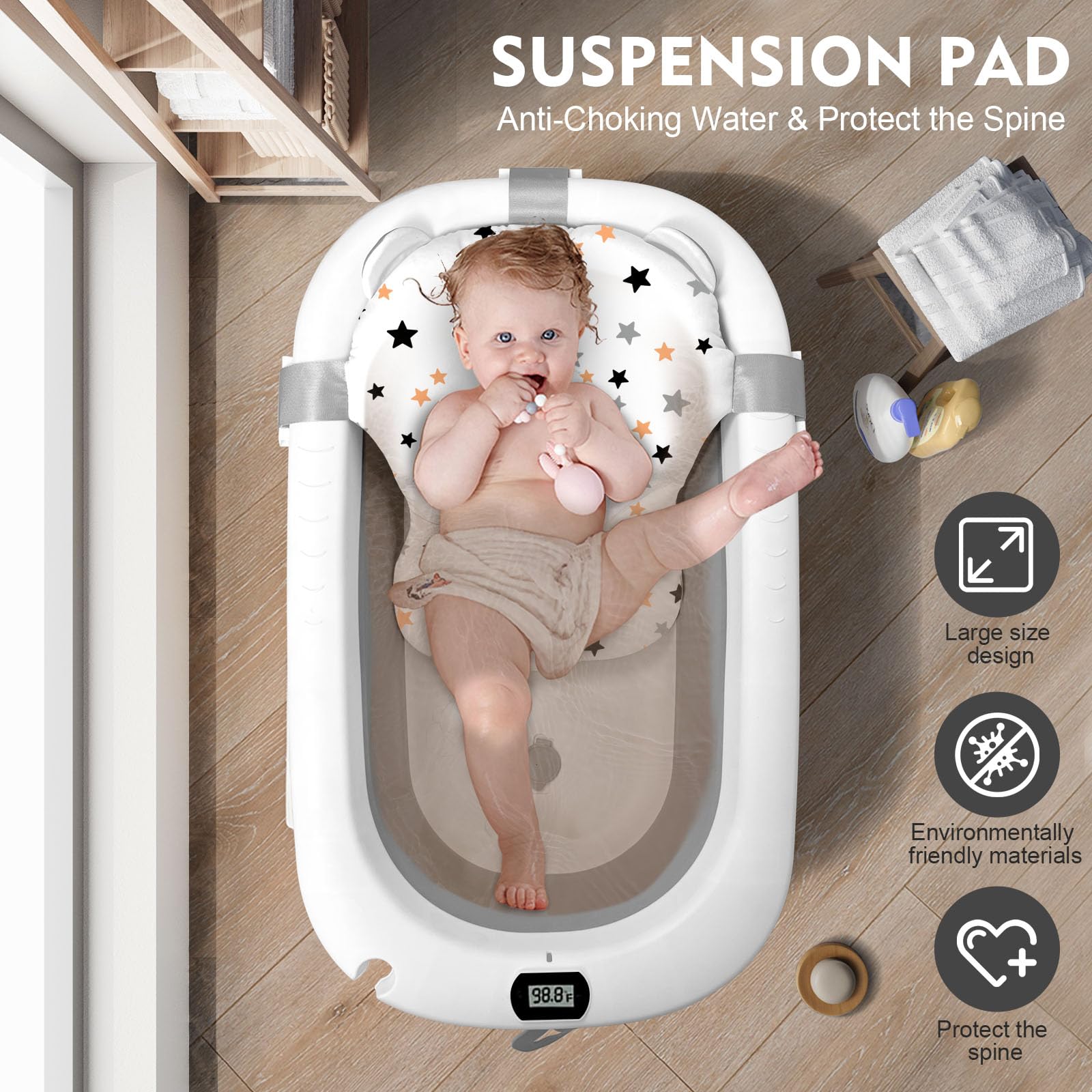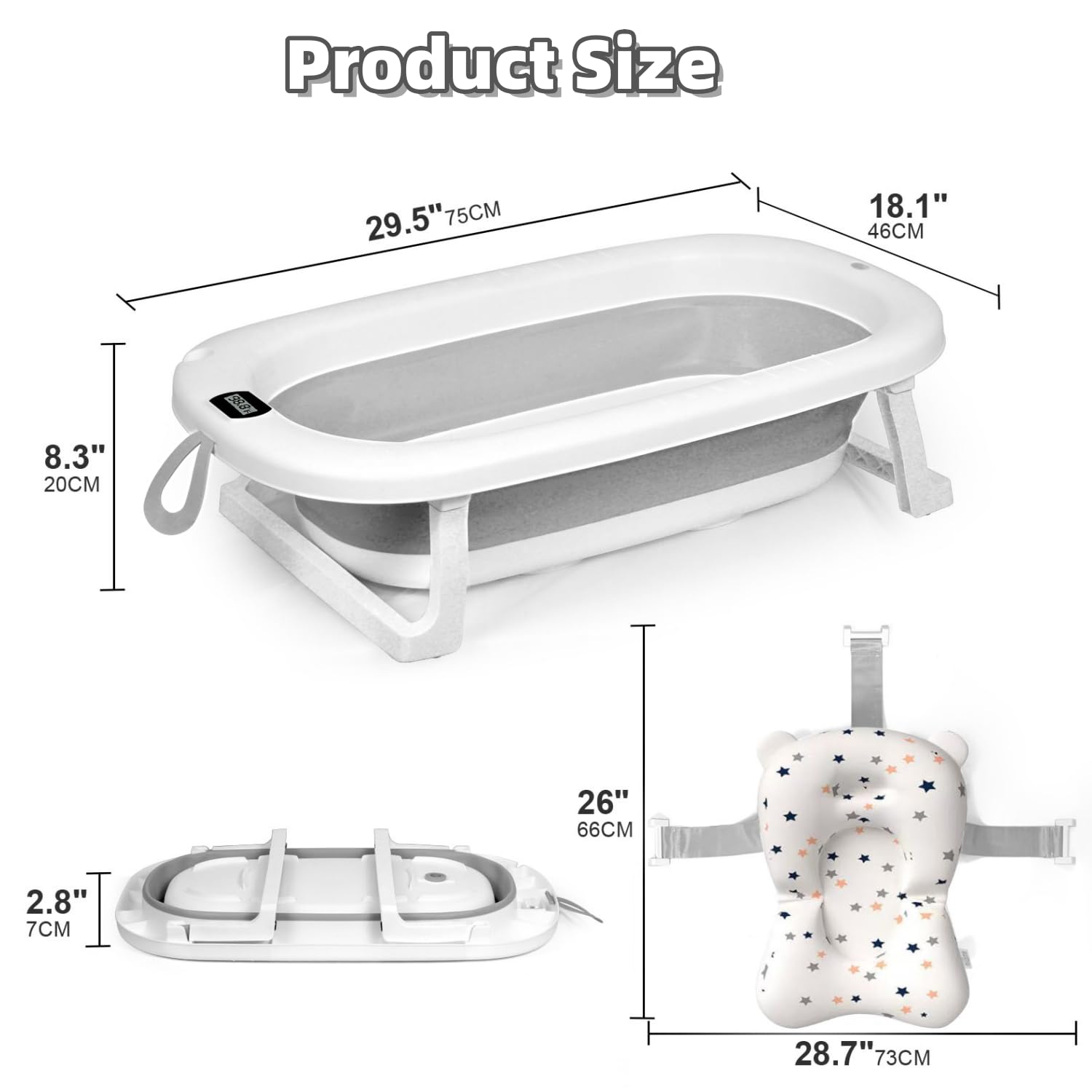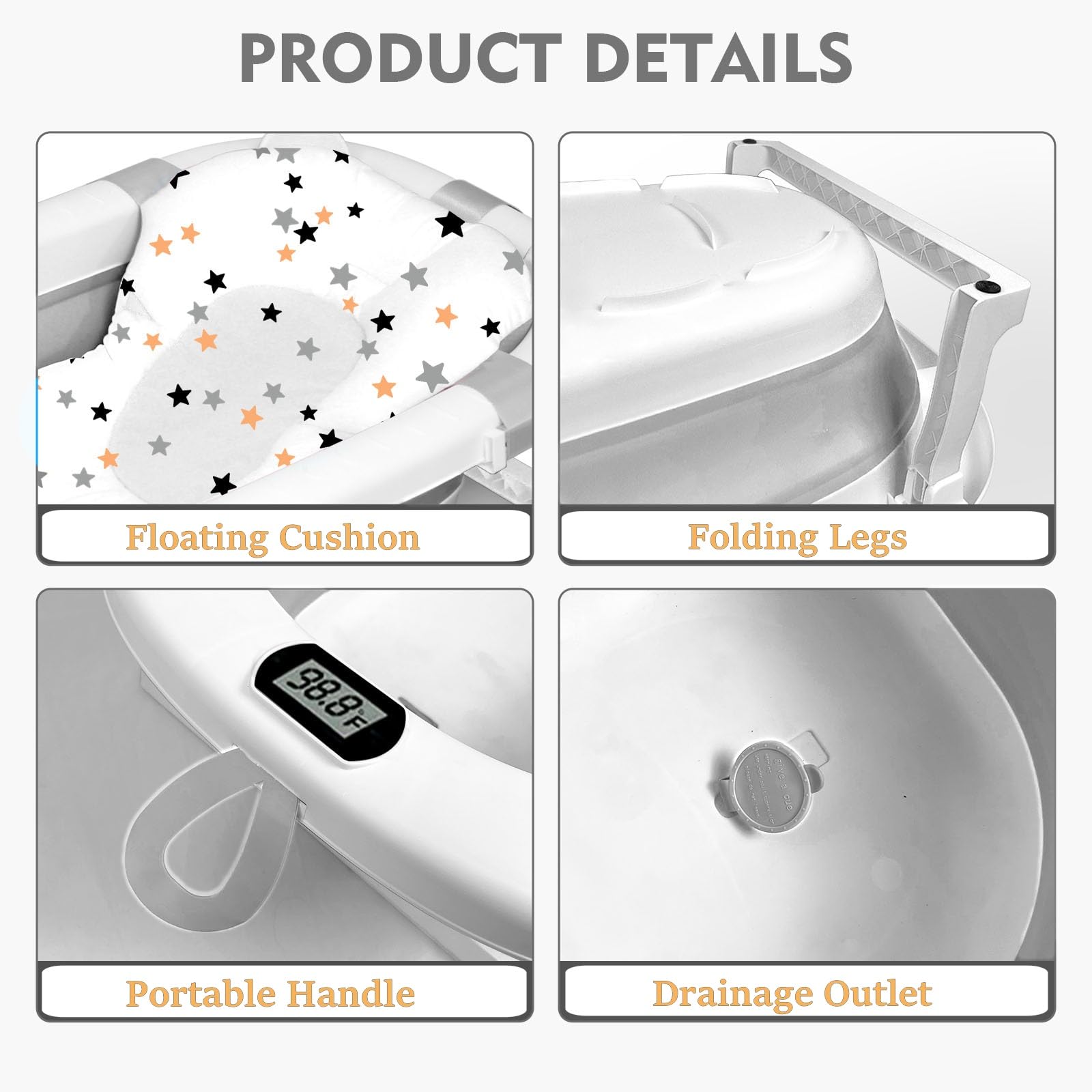 SKY-TOUCH Baby Foldable Bathing Tubs with Soft Bathmat Cushion & Thermometer, NewBorn Babybath Tub with Drain Hole, Non-Slip Support Leg for 0-6 Years Boy Girl (Grey)