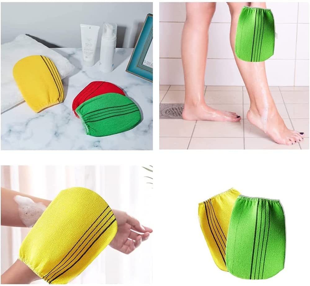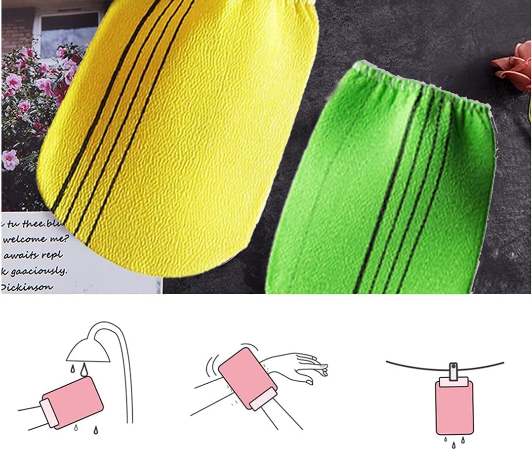 - سهل الاستخدام: خذ حمامًا دافئًا، ثم ضعي الصابون أو جل الاستحمام على بشرتك، ثم افركي جسمك لأعلى وأسفل. فقط نظفيه بالماء، وعلقيه وجففيه بالهواء. مع حلقة تعليق، يمكنك تعليقها في أي مكان. قفازات التقشير: 3 قطع بألوان عشوائية.