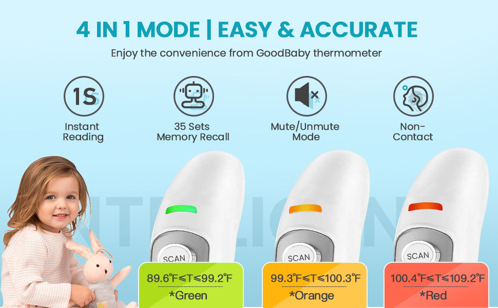 - Smart Fever Indicator: The color-coded fever warning system lights up in green, yellow, or red based on the temperature reading, helping you quickly assess the situation—green for normal, orange for mild fever, and red for high fever.