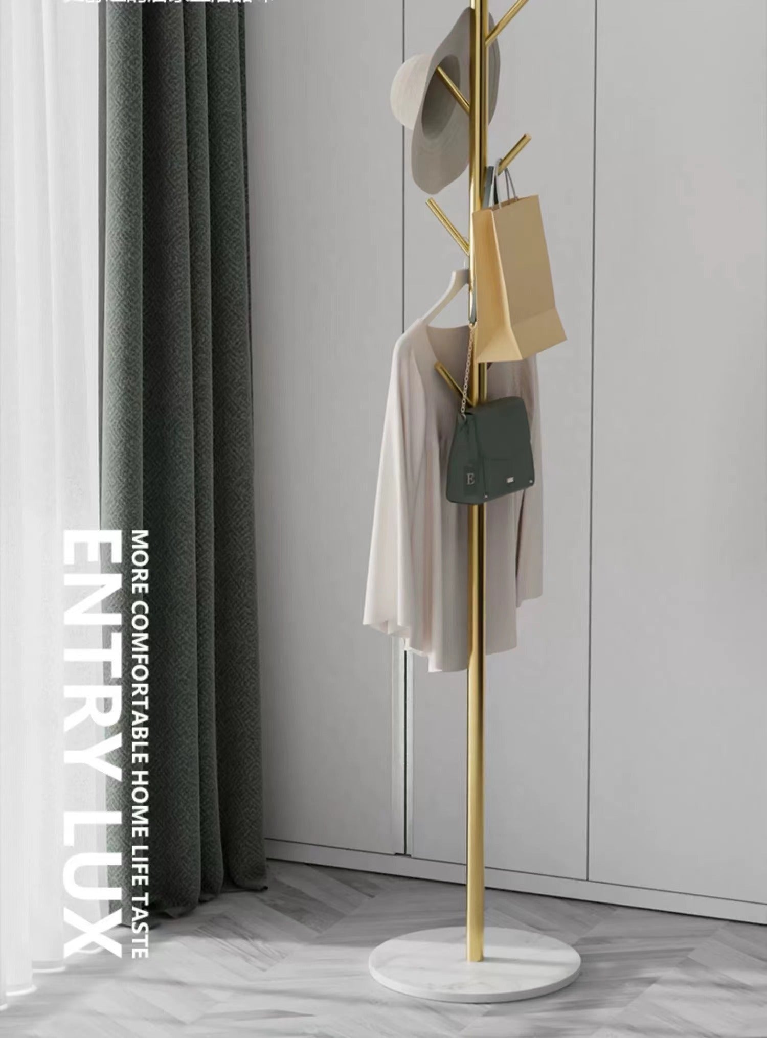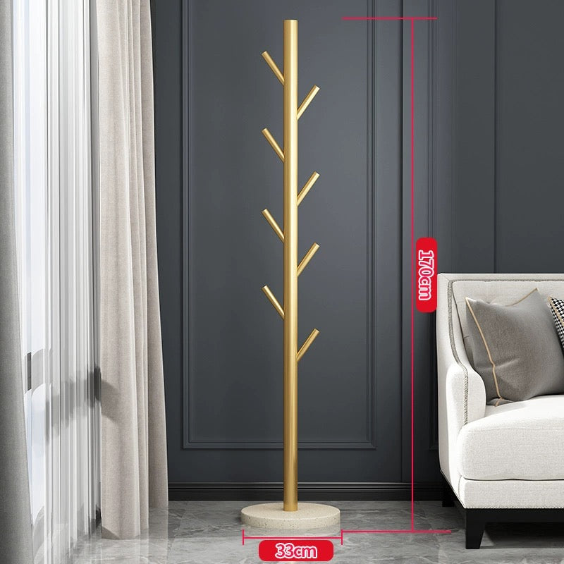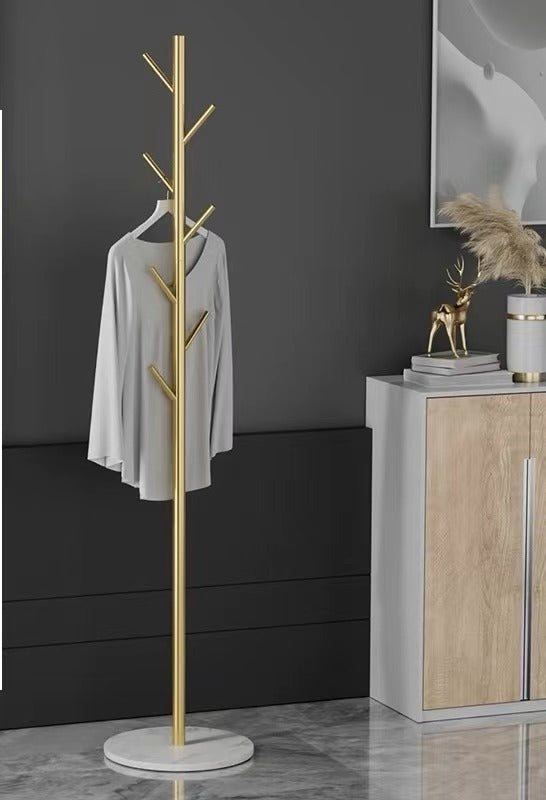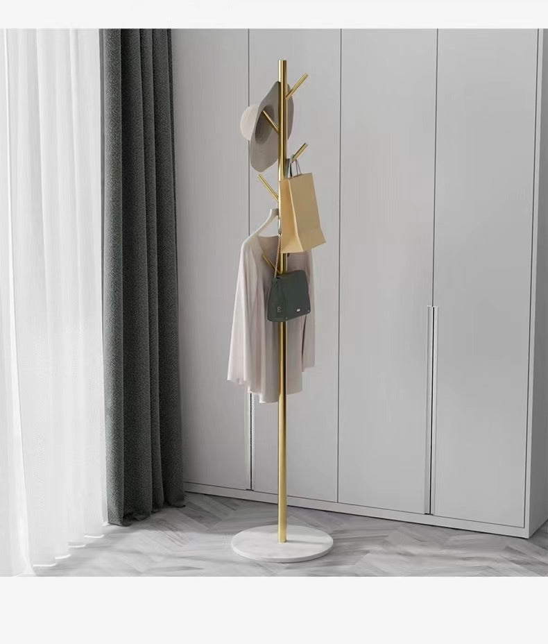 SKY-TOUCH Free Standing Hall Coat Tree with 8 Hooks, Stand Tree Rack with Marble Round Base, Entryway Coat Stand for Purses, Clothes, Scarves, for Hallway, Bedroom, Living Room, Golden Color