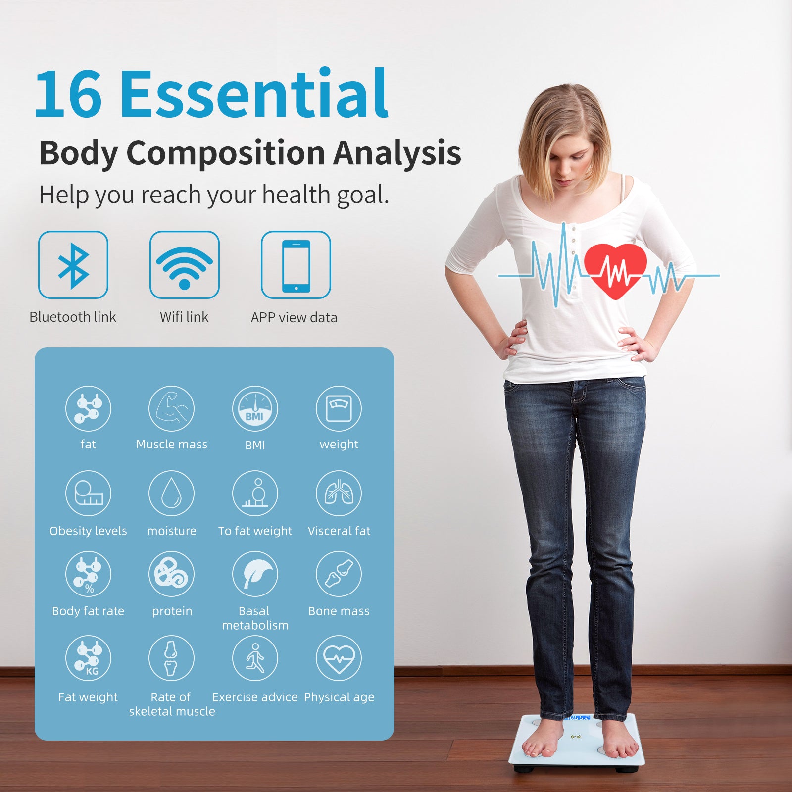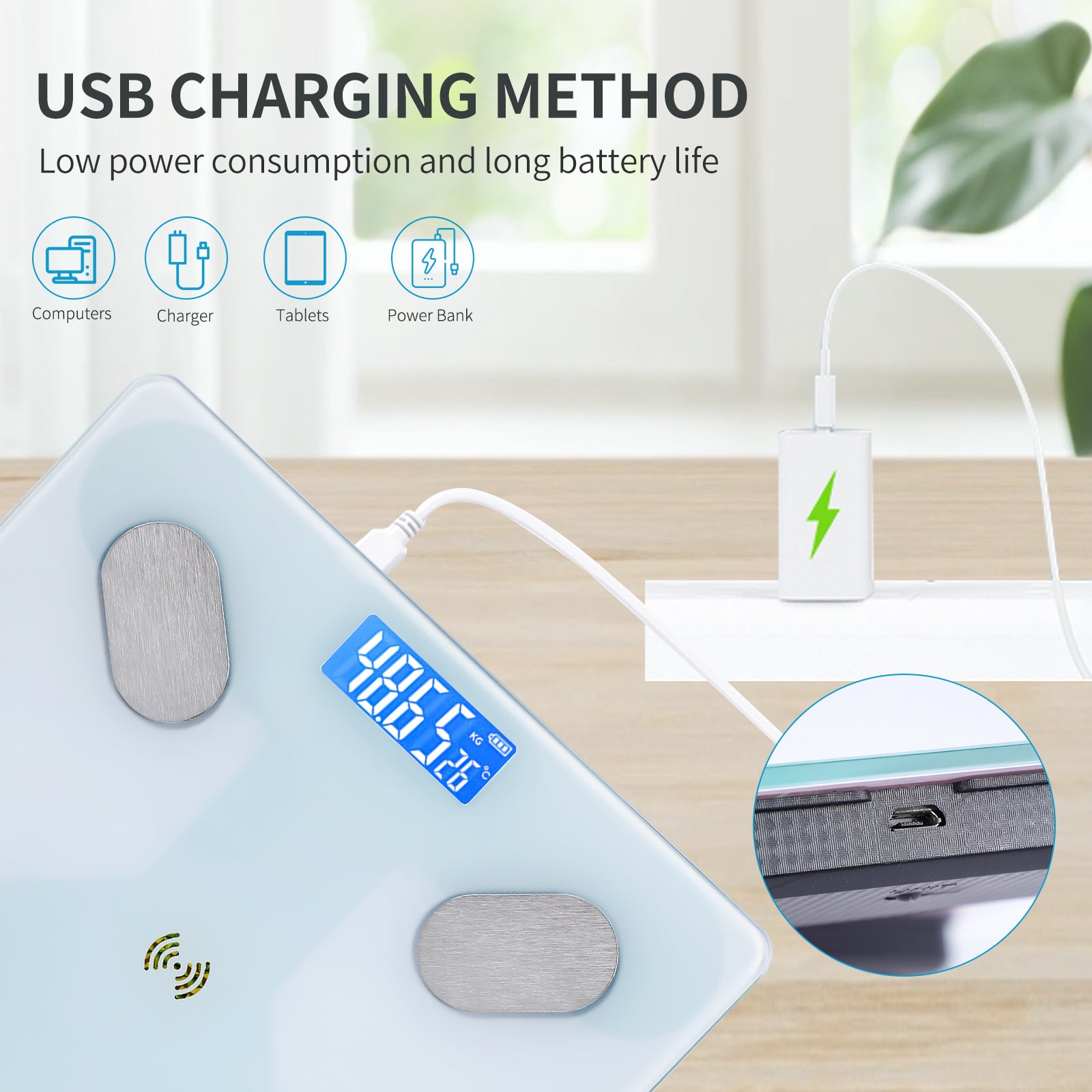 مقياس دهون الجسم الذكي متعدد الوظائف من SKY-TOUCH، ميزان حمام رقمي إلكتروني LED مع تطبيق الهاتف الذكي، يدعم 17 لغة وقياس درجة الحرارة في الأماكن المغلقة، 260*260*23 مم أبيض