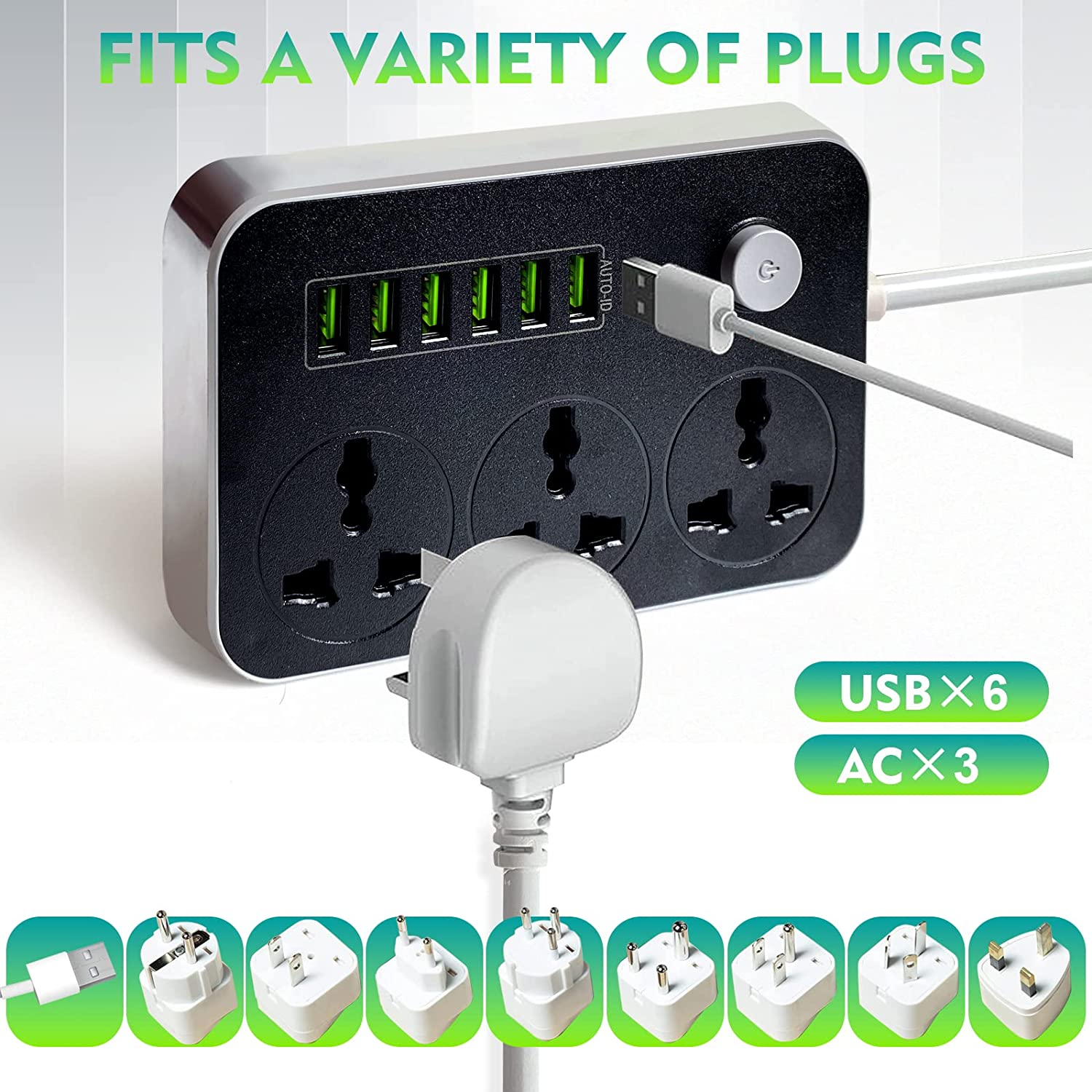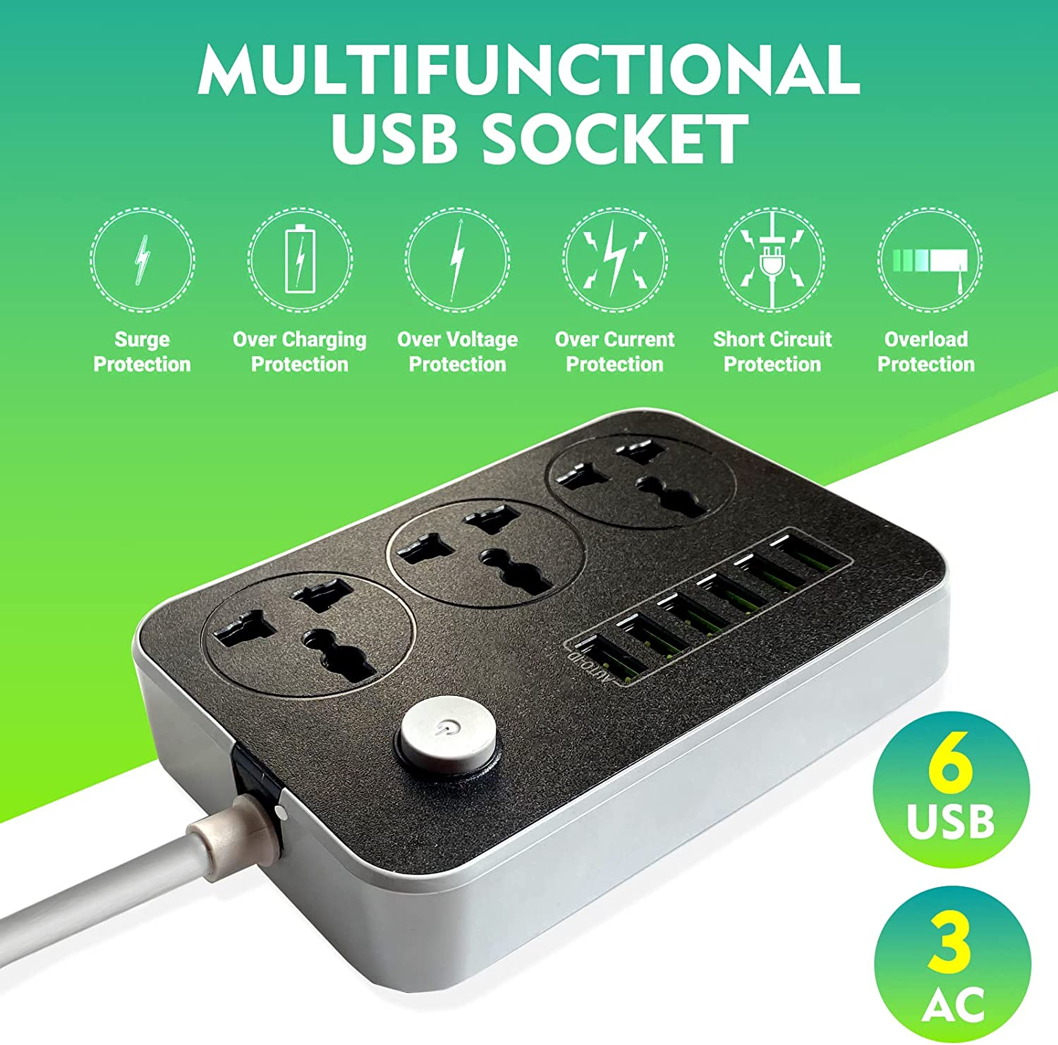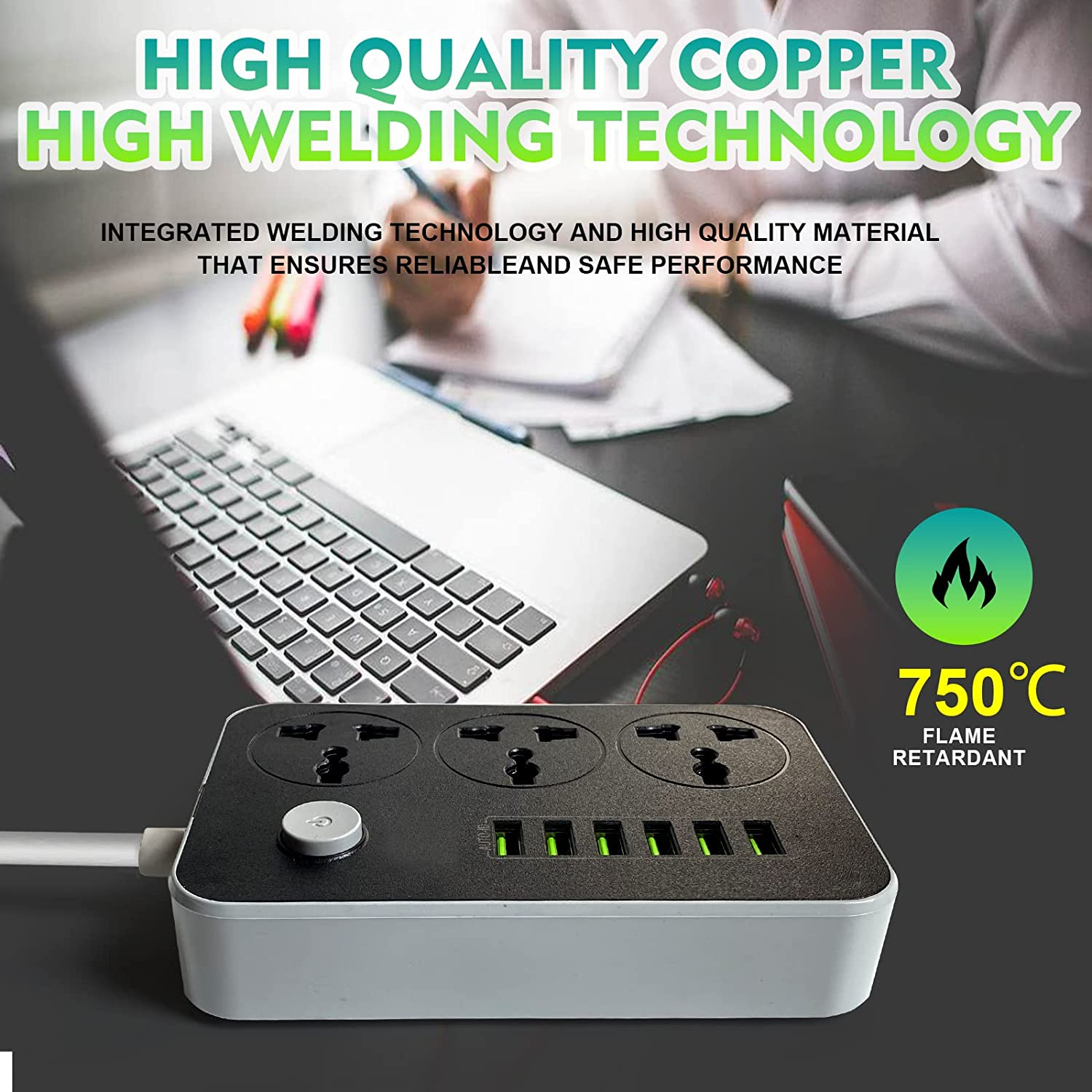 سلك تمديد شرائط الطاقة SKY-TOUCH 3 منافذ، مقبس طاقة مع 6 منافذ USB مقبس شحن عالمي مع سلك تمديد جريء 2 متر