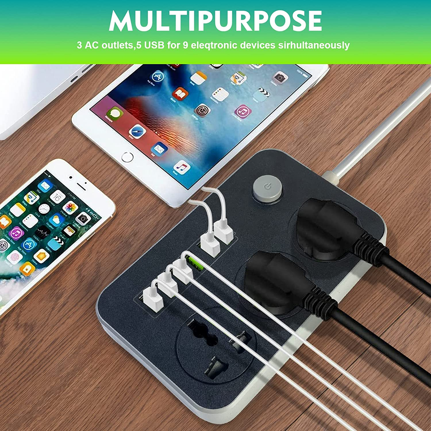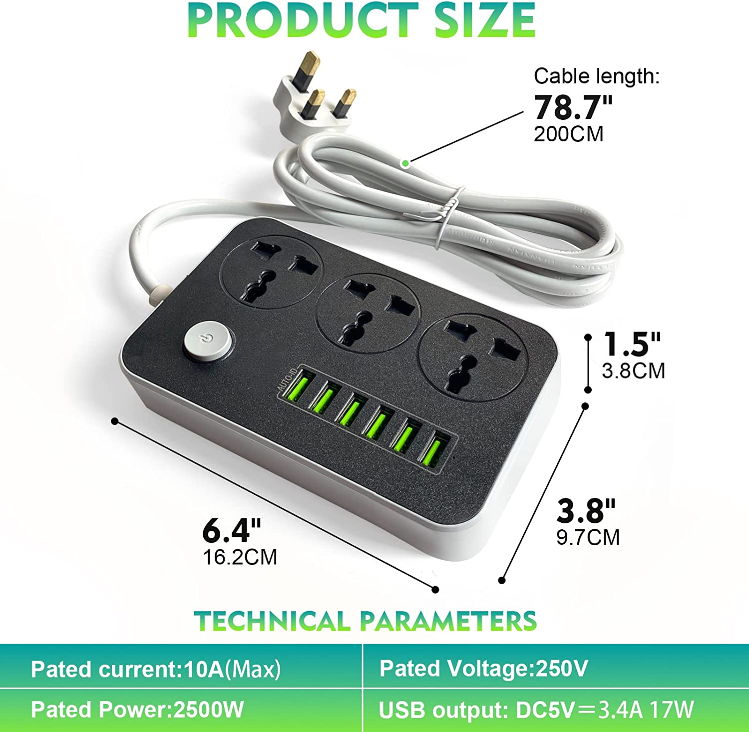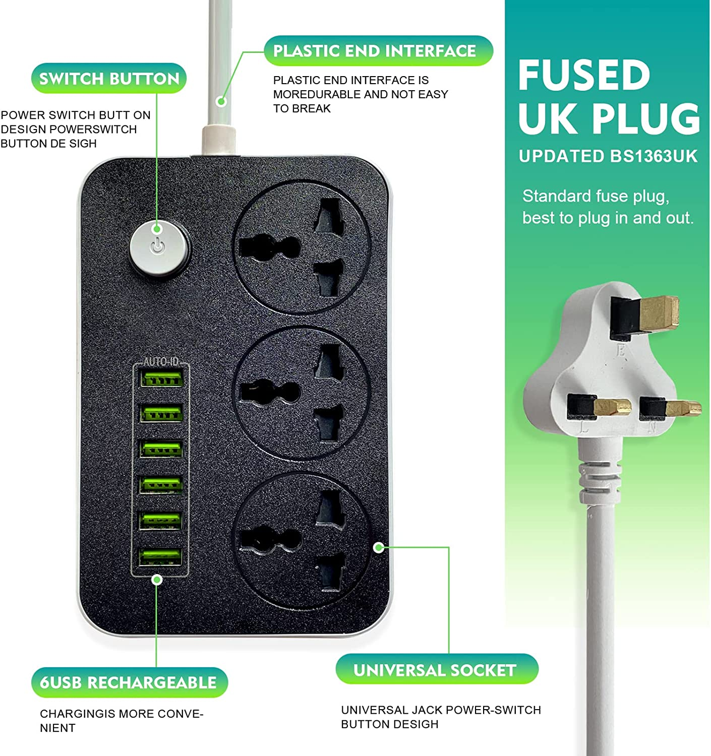 سلك تمديد شرائط الطاقة SKY-TOUCH 3 منافذ، مقبس طاقة مع 6 منافذ USB مقبس شحن عالمي مع سلك تمديد جريء 2 متر