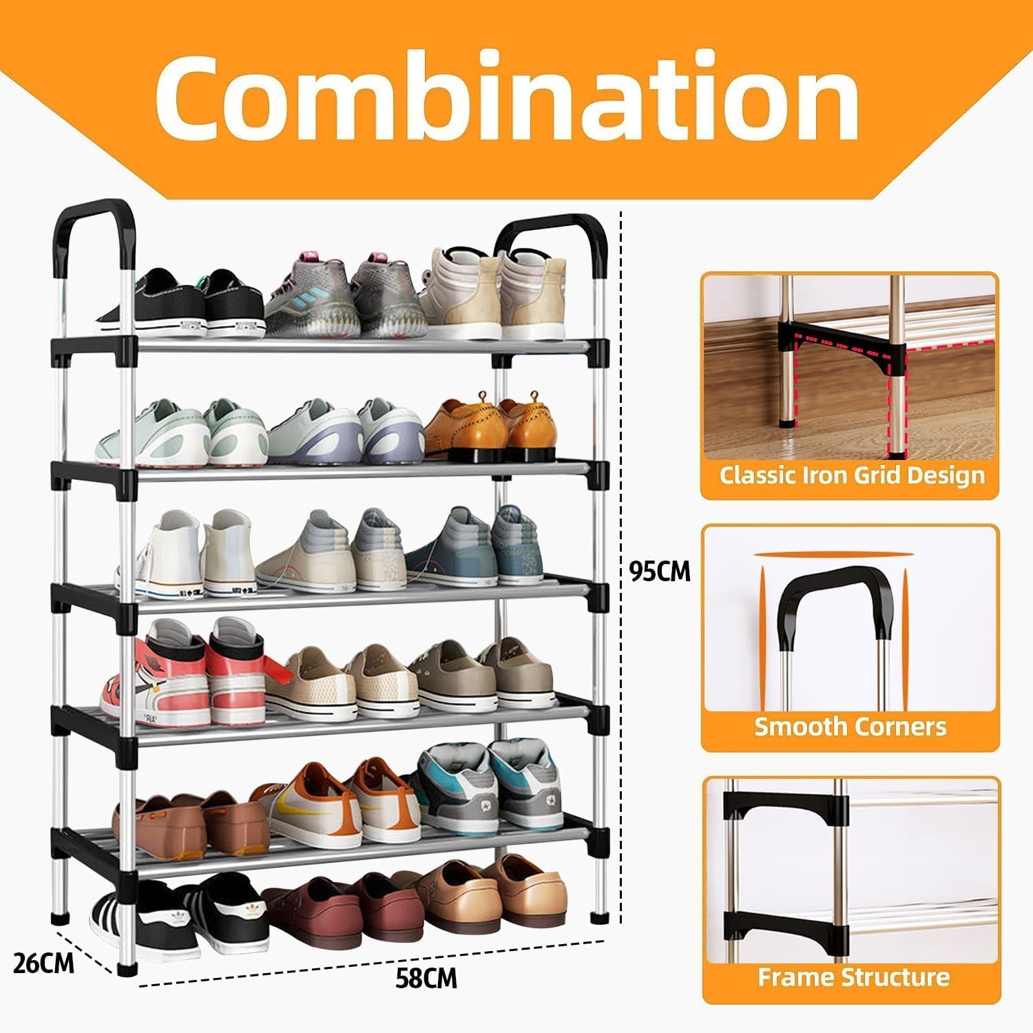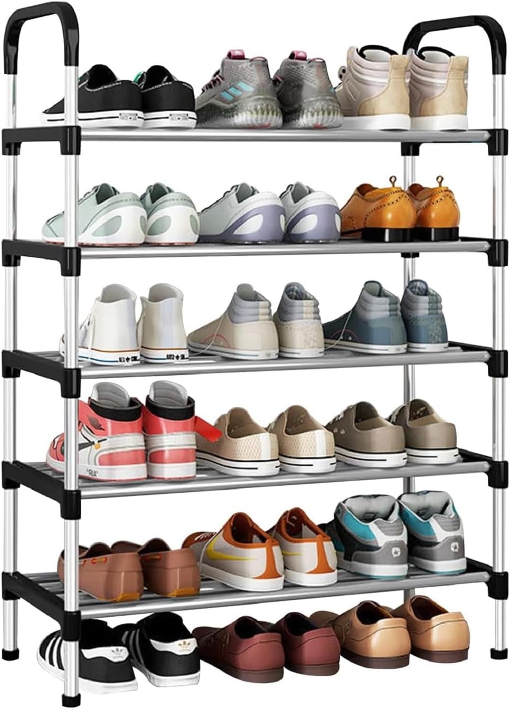 - Large Capacity & Space-Saving:This 5-tier shoe rack holds up to 18 pairs of women’s shoes or 15 pairs of men’s sneakers. Compact size (58×26×95 cm) makes it perfect for small spaces while offering maximum storage.