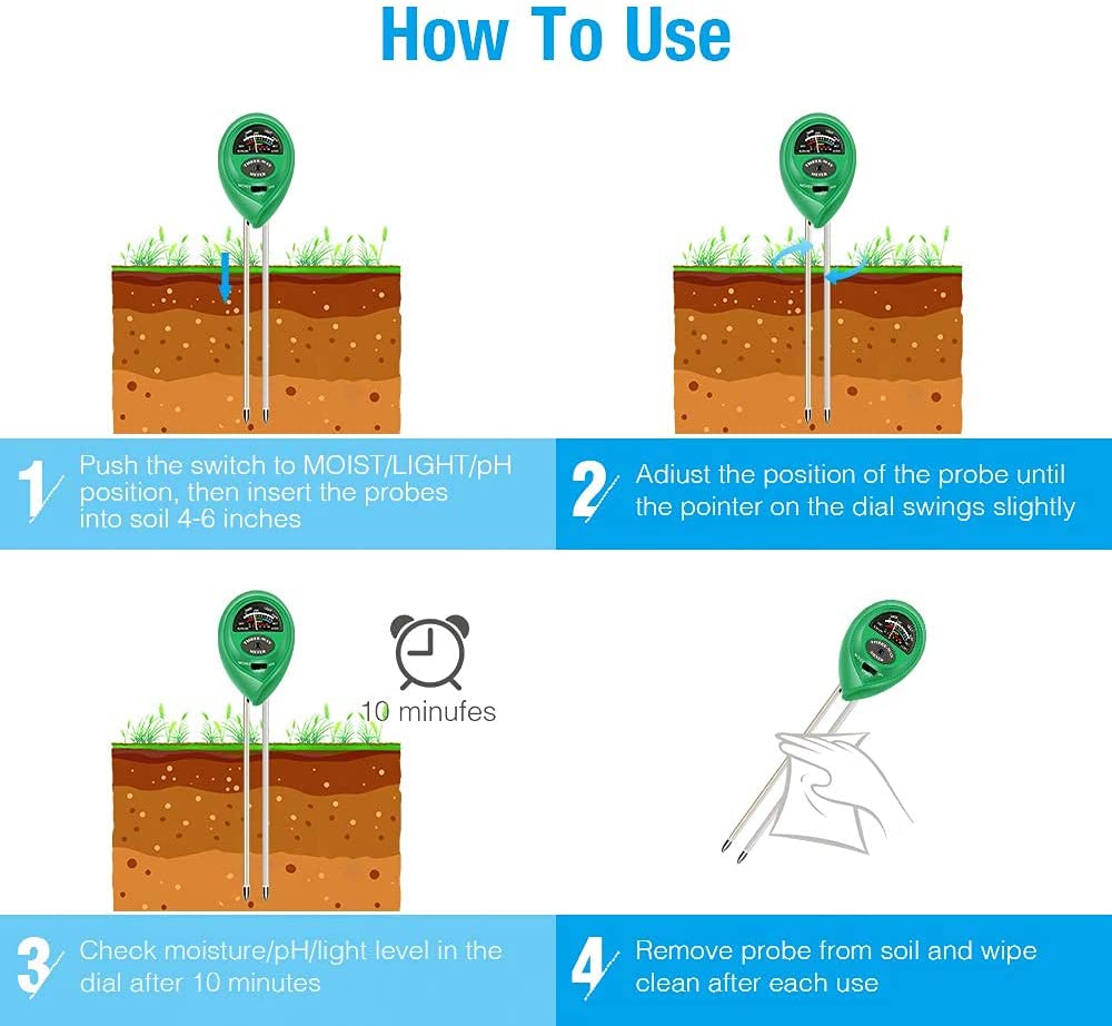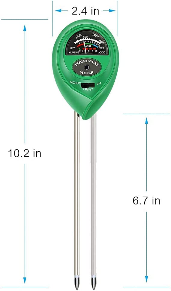 وظائف 3 في 1: يمكن لمقياس الرقم الهيدروجيني للتربة قياس رطوبة التربة وقيمة الرقم الهيدروجيني وكثافة ضوء الشمس. إنه مفيد لزراعة الزهور والنباتات وجعلها تنمو بشكل صحي وقوي (لا يمكن استخدام جهاز اختبار التربة هذا إلا في التربة، ولا يمكن استخدامه لاختبار السوائل). سهل الاستخدام - مقياس درجة حموضة التربة ببساطة أدخل المسبار في الأرض حوالي 10 إلى 6 بوصات (2/3 المسبار)، وستحصل على قراءتك. صغير الحجم للاستخدام الداخلي والخارجي: تعرف على وقت الري أو ضبط درجة الحموضة أو تغيير إضاءة زهورك ونباتاتك في الداخل والخارج. لا حاجة إلى بطاريات - 3 في 1 مقياس درجة حموضة التربة، لا حاجة إلى بطاريات أو كهرباء، قم بالتوصيل والقراءة. دقيق علميًا: يمكن للمسبار الحساس لمقياس درجة حموضة التربة اكتشاف التغيرات في الأرض ونقل التفاصيل إلى الموصل، مما يعرض القيم الدقيقة لك. |