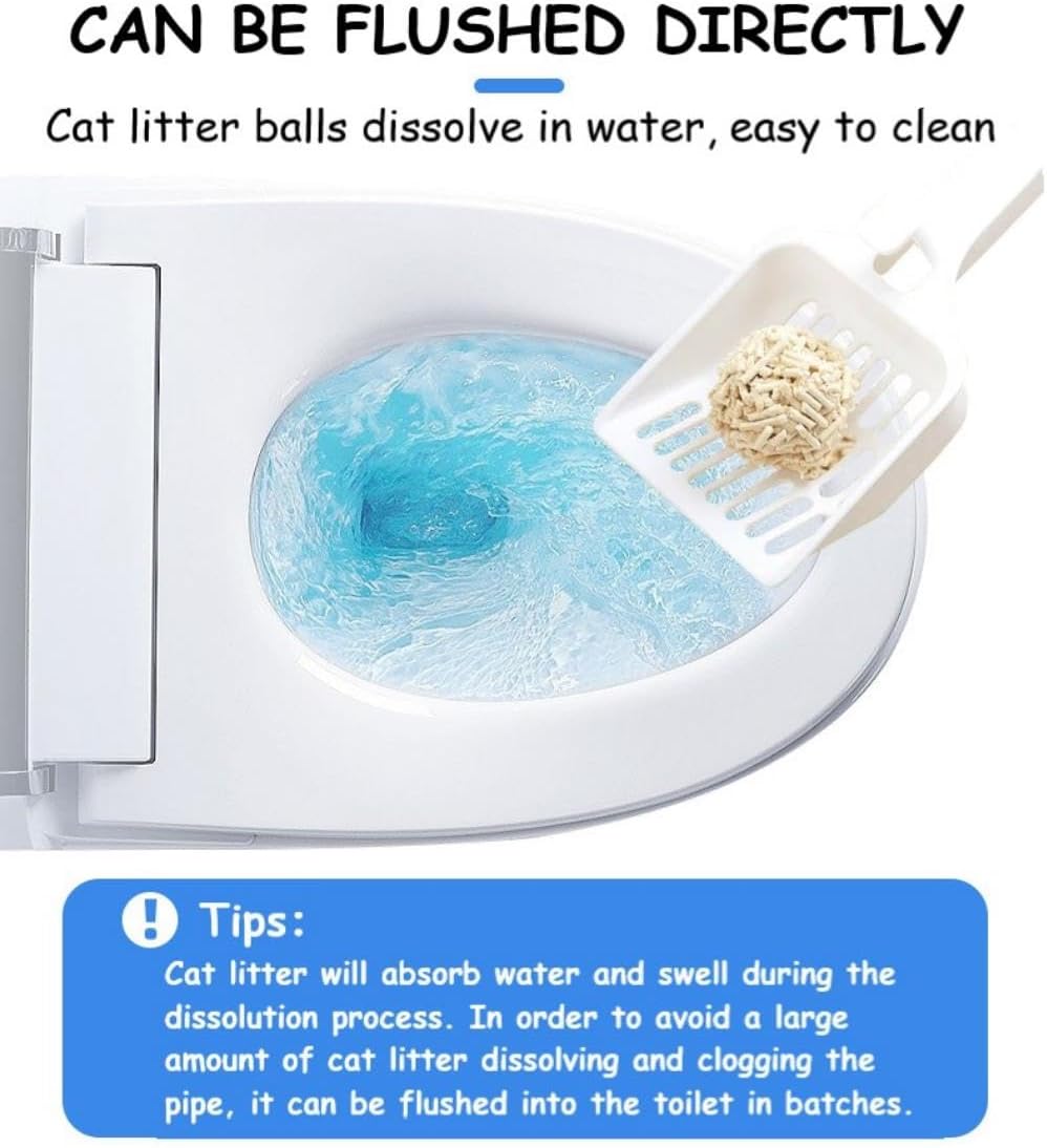 - Quick Clumping & Flushable Absorbs moisture in just 2 seconds and forms tight clumps in 3 seconds, making it easy to scoop and it won't stick to the cat litter box. This biodegradable, flushable litter can be safely flushed down the toilet (avoid flushing too much at once)
