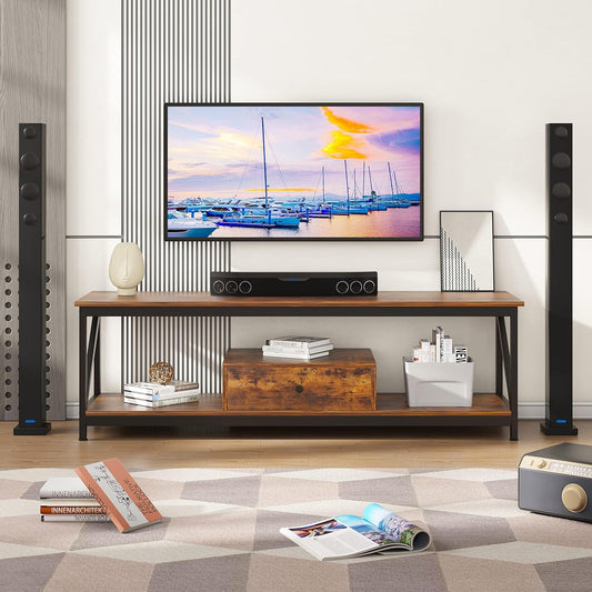SKY-TOUCH TV Stand : Modern TV Table with 1 Drawer Wide TV Entertainment Center with Storage Shelves Sturdy Wooden TV Console Table with Metal Frame for Living Room (140 * 40 * 43CM Grey/Tiger Wood)