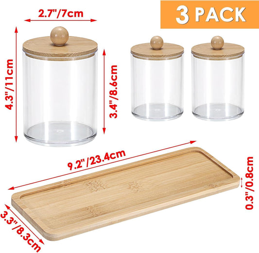 SKY-TOUCH 3-Pack Bathroom Jars Qtip Holder with Bamboo Lids, Acrylic Clear Apothecary Canisters for Cotton Balls, Q-tips, Floss, and Swabs – Includes Tray for Organized Bathroom Accessories