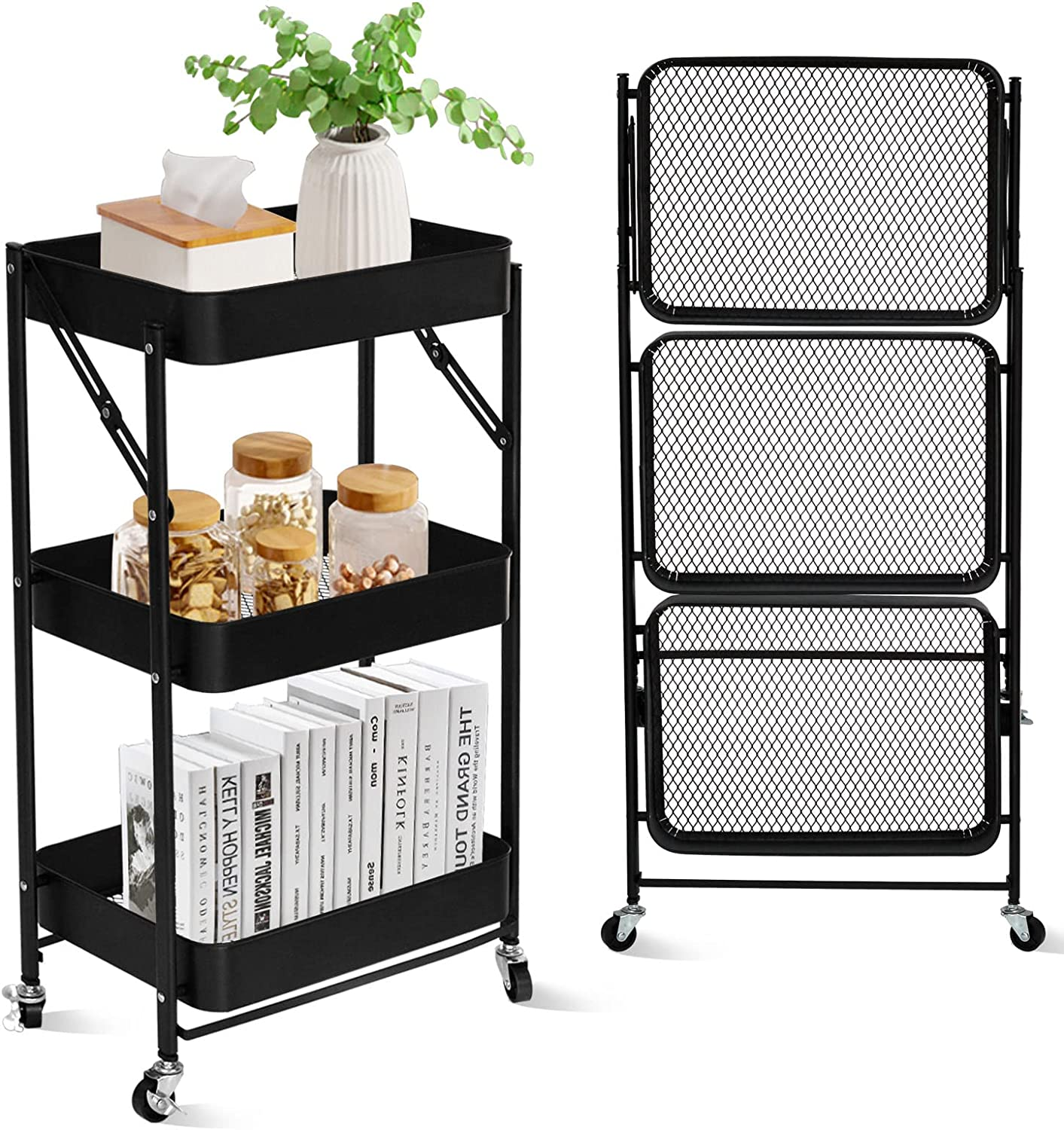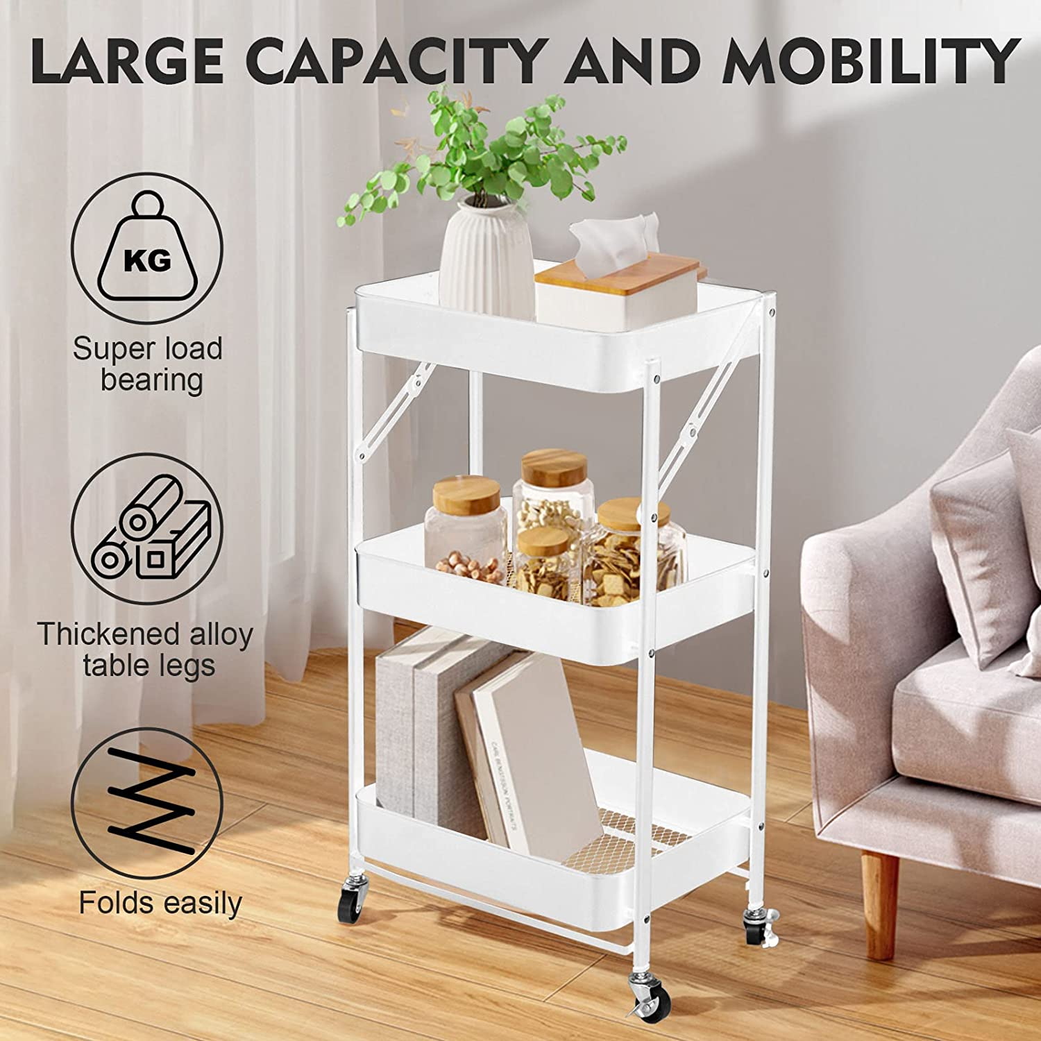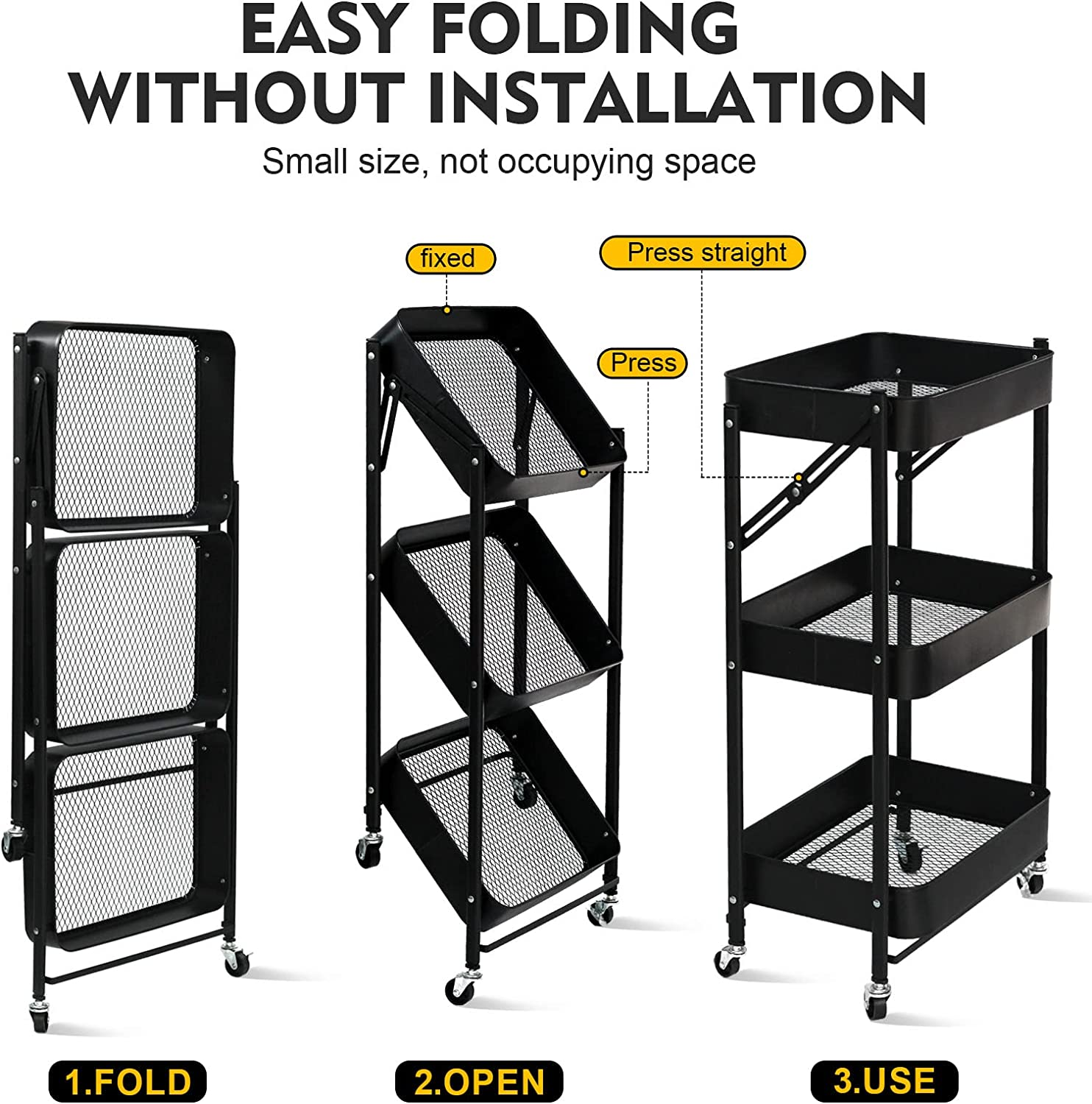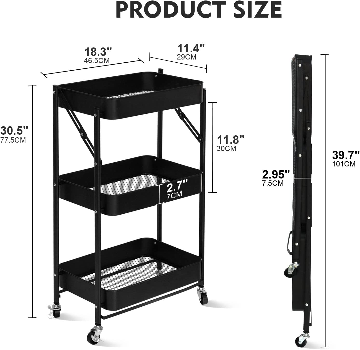 SKY-TOUCH 3 Tier Foldable Metal Rolling Utility Cart Organizer, 46x30x76cm Multipurpose Organizer Trolley with Casters for Kitchen, Bedroom, Bathroom, Office, Laundry Room and Garage