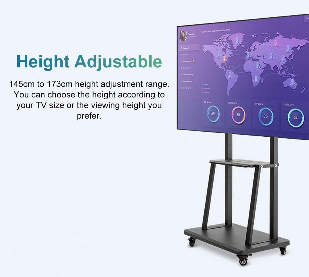 - Adjustable Height - The rolling tv cart allows you to adjust the height from 55in to 64in to fits different angles up and down, you can easily raise monitors off and position them in a perfect viewing angle, provides maximum ergonomic comfort to relieve eye, neck and back strain