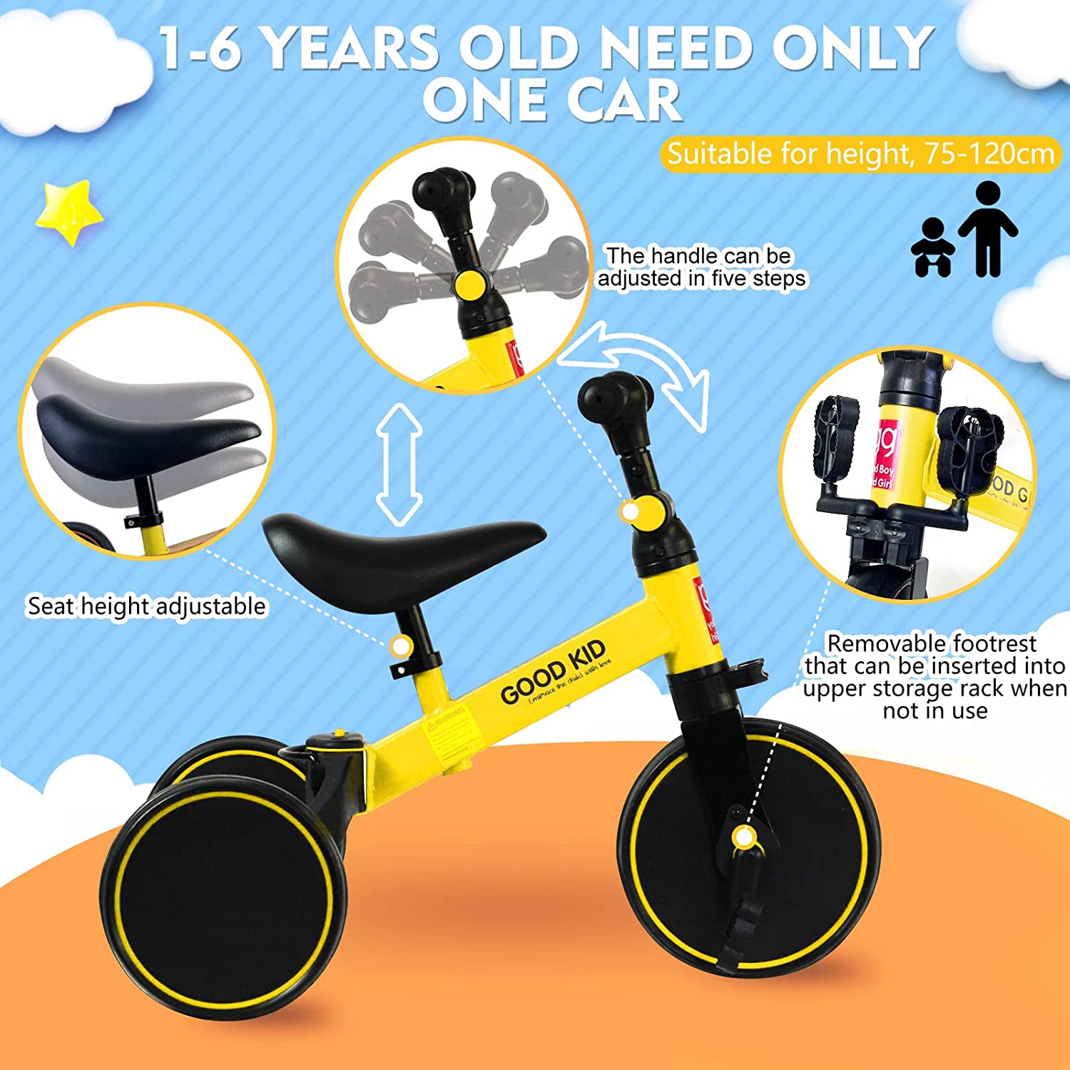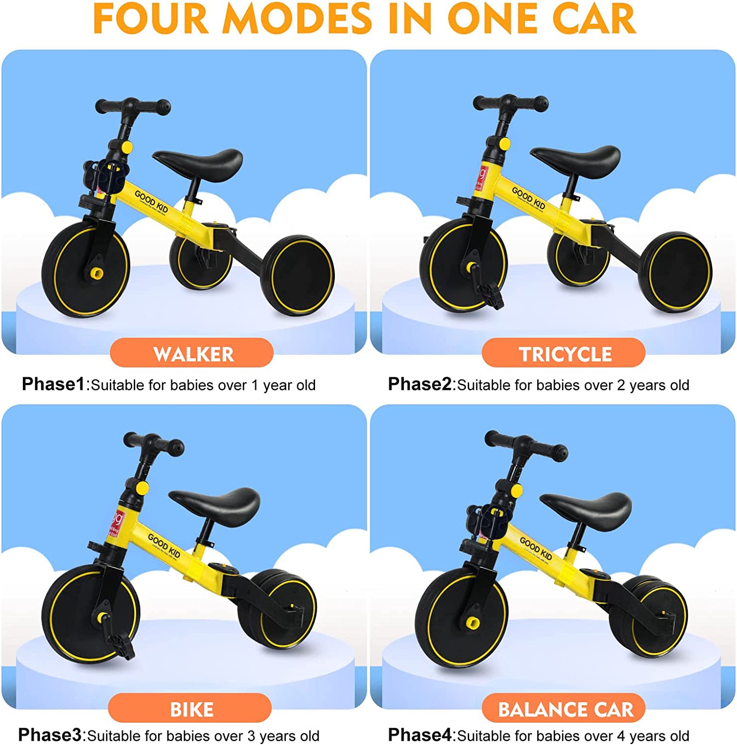 SKY-TOUCH 4 in 1 Kids Balance Bike Kids Tricycles for 1-4 Years, Toddlers Trike with Adjustable Seat Indoor Outdoor, Boys Girls Kids First Birthday Gifts Yellow