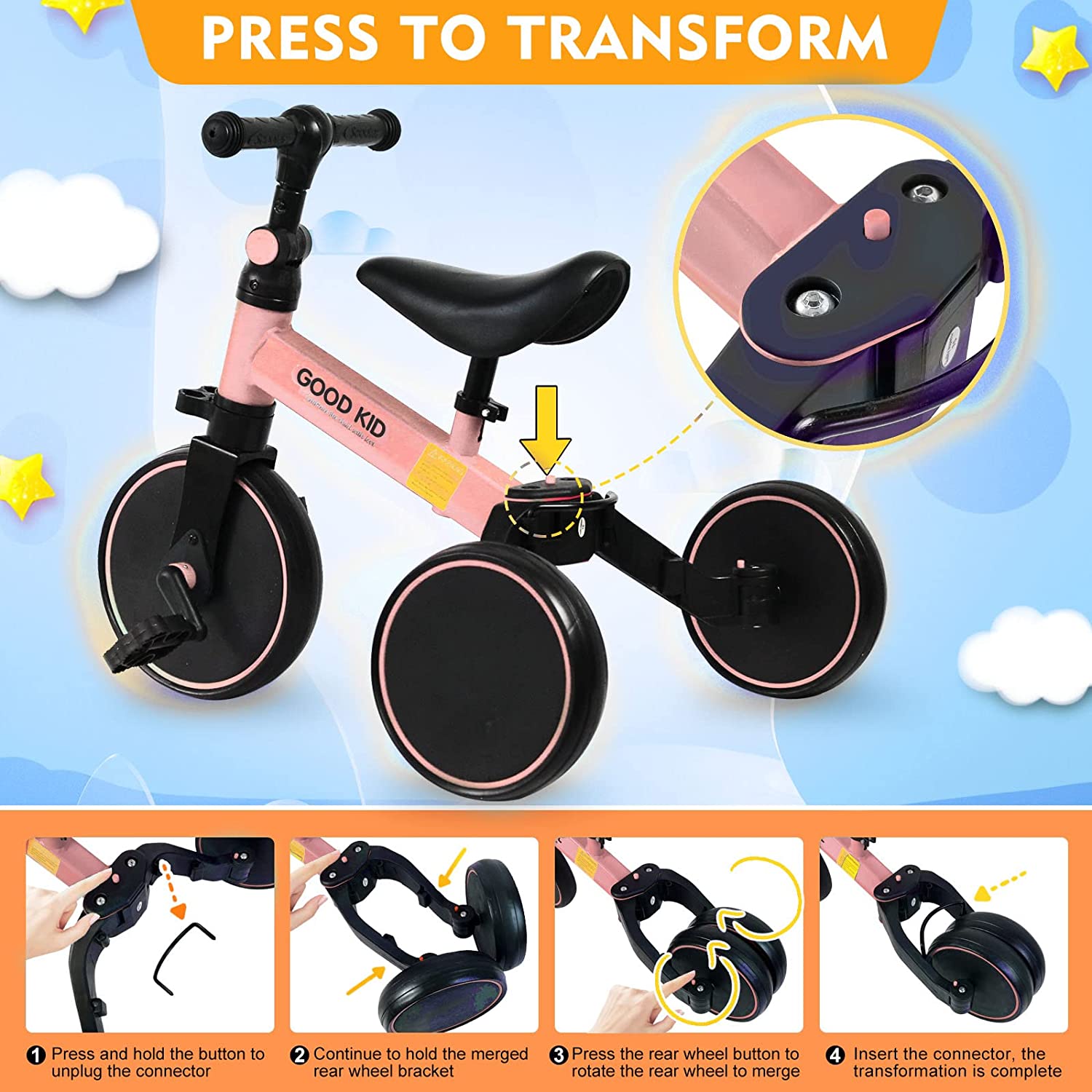 SKY-TOUCH 4 in 1 Kids Balance Bike Kids Tricycles for 1-4 Years, Toddlers Trike with Adjustable Seat Indoor Outdoor, Boys Girls Kids First Birthday Gifts Pink