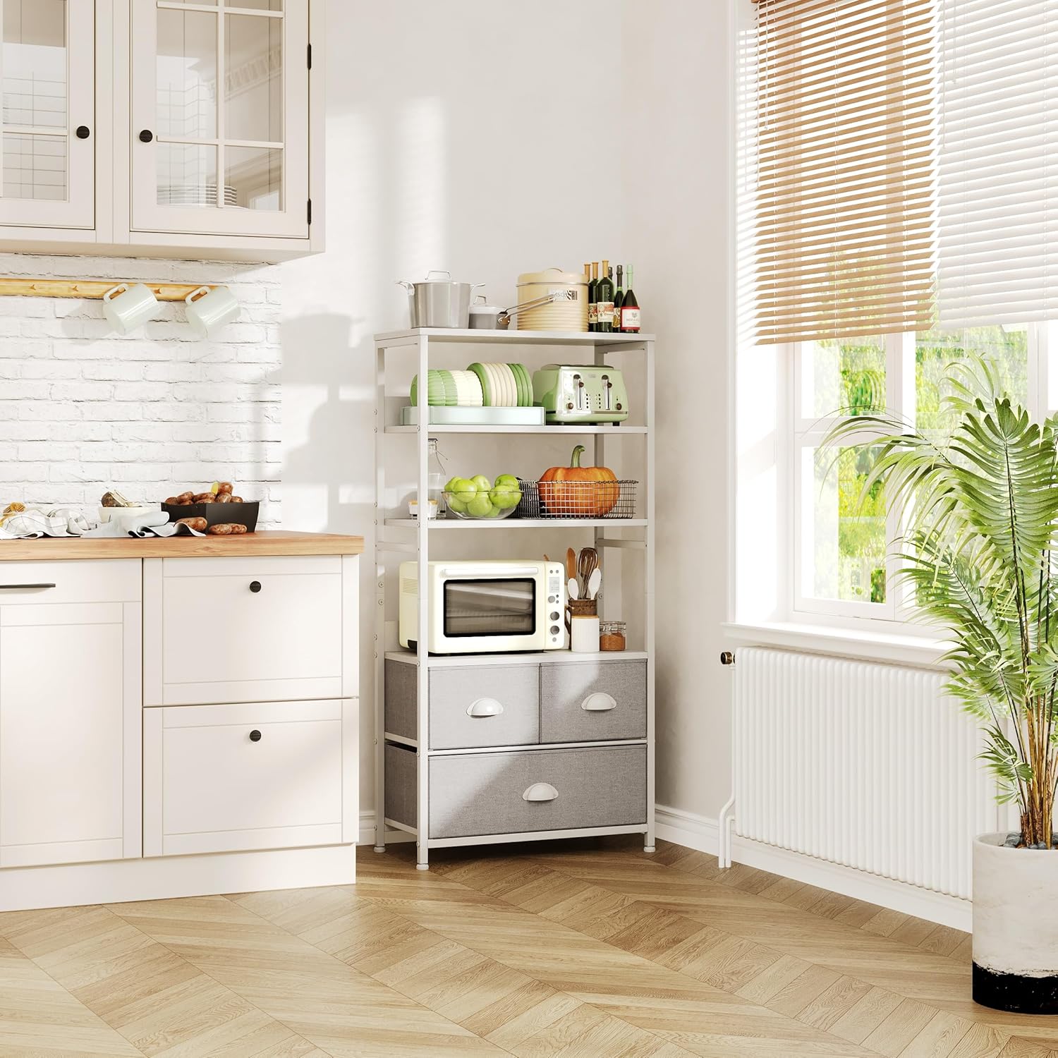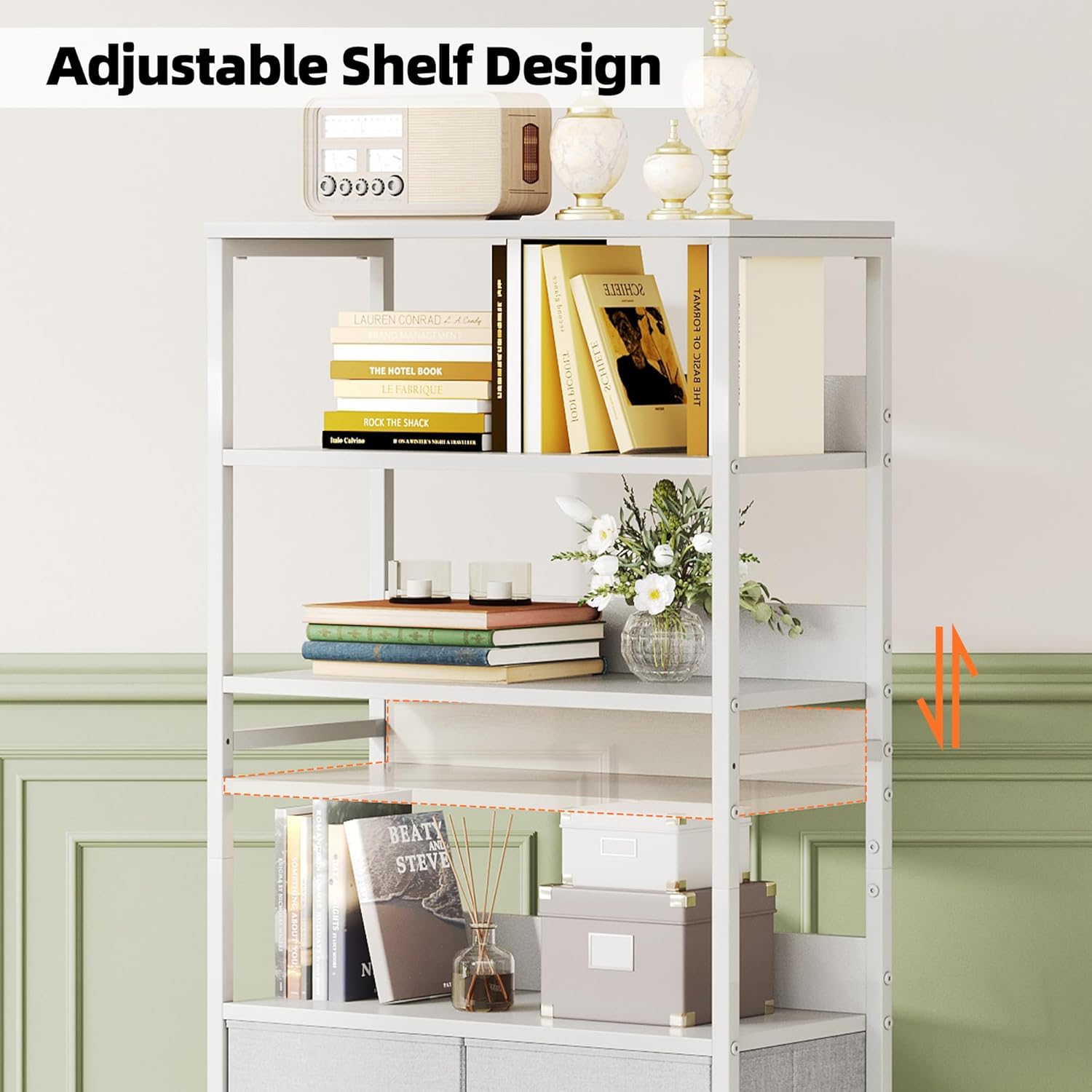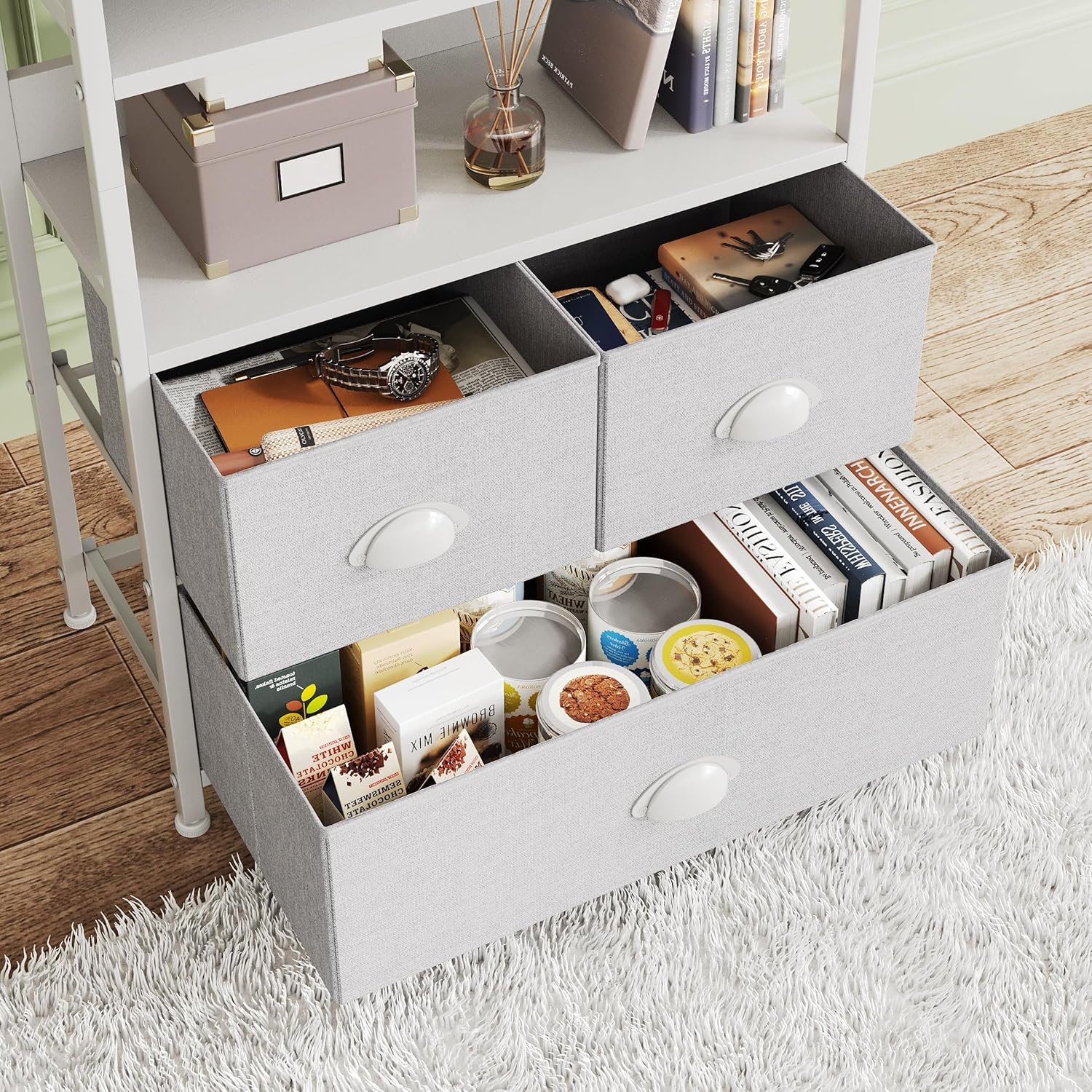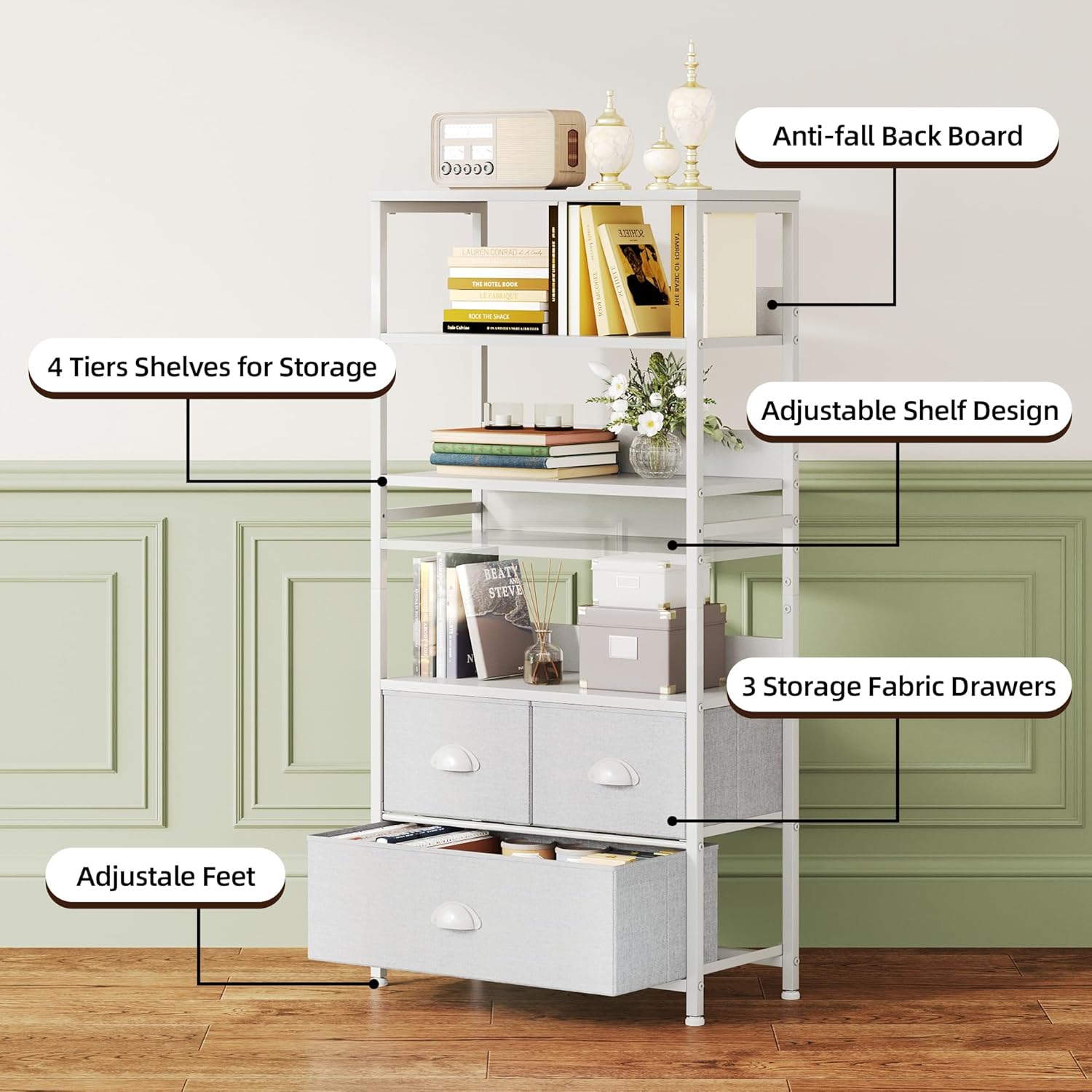 SKY-TOUCH 4-Tier Storage Drawer Shelf with 3 Fabric Drawers – Metal Frame & Wood Top,– Ideal for Books, Photos, and Decorations in Living Room, Office, Bedroom, and Kitchen,White 22.9 * 11.6 * 56.7 in