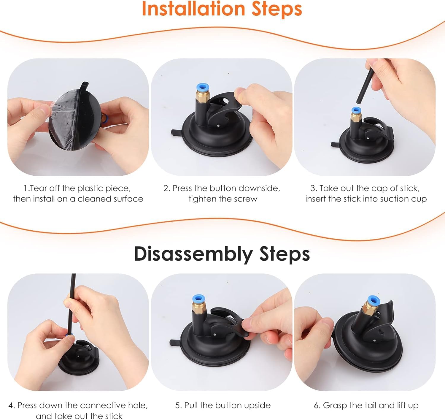 - USING TIPS:1. Choose a smooth and clean area to stick the suction cup to it; 2.Clean the base to recover the stickiness if the suction cup is dirty or not sticky; 3. After cleaning the base, let it dry naturally instead of wiping it with tissue or cloth; 4.remember to squeeze the base from top to bottom to let out all the air before pushing the lever down