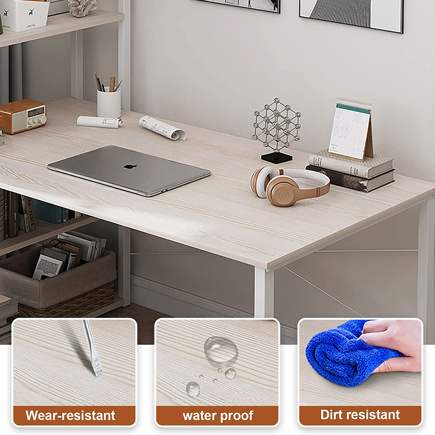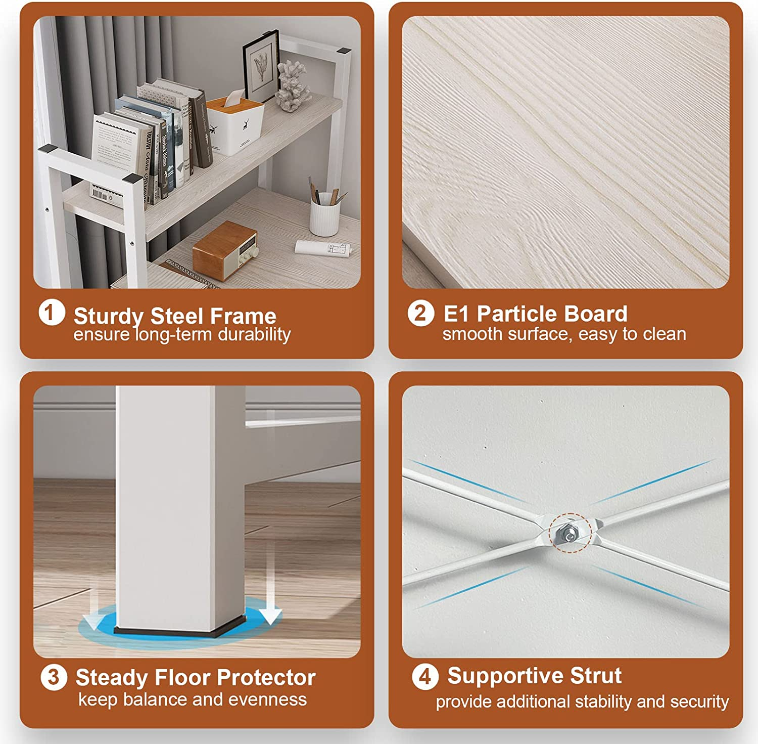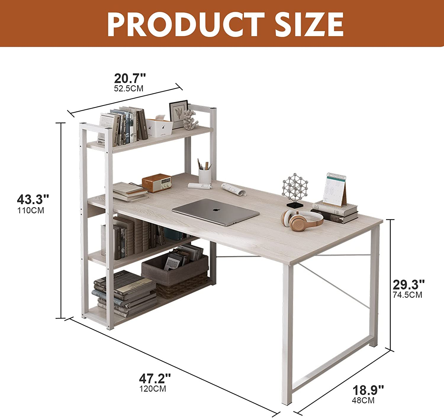 【Variety of Display】You can arrange the desk and bookshelf according to your own needs. Bookshelves can be exchanged around the position. We can promise you'll love this desk. Made of the textured surface, the modern desk is anti-skidding, anti-scratch, and easy cleaning. 【Durable & Sturdy Construction】constructed by high quality board and steel tube, offers large weight capacity. “X” style design provides more support and ensures stable and durable. Desk size: 120 x 48 x 72 cm & Bookshelf: 48 x 24 x 110 cm. 【Compact Design & Protective Feet Pads】Compact design won't take a lot of your space while offering the ideal organization solution. The computer desk comes with feet pads, protect your floor from scratches. And the desk can keep more stable in uneven places. 【Spacious Desktop & Ample Storage Shelves】Computer Desk can be placed in your home study, bedroom and office to serve as a computer desk, office work station, study table, writing desk. The 4 tier shelves can hold your books, toys, collectibles, learning tools, work materials, daily necessities, etc. 【Easy to Assemble】Fast Installation & Easy Cleaning: To make assembling this sturdy H-shaped desk as effortless as possible, we have included quite clear and detailed instructions, numbered parts, and all necessary tools in the package. |