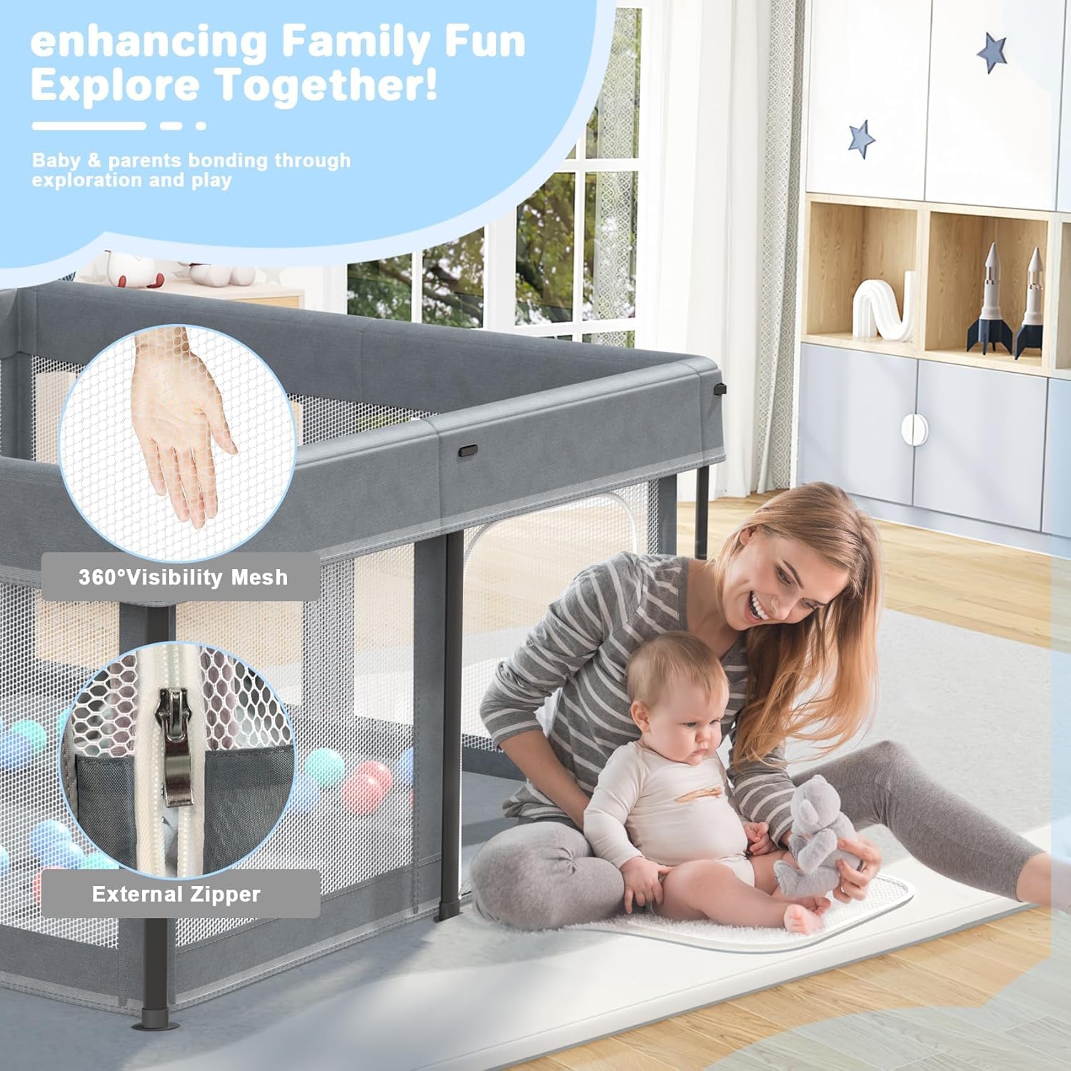 SKY-TOUCH Foldable Baby Playpen 125x125x65cm, Sturdy Anti-Fall Baby Playpen with Breathable Mesh, Portable Play Pen for Babies and Toddlers, Indoor & Outdoor Baby Play Area, Gray - 2 Pull-Up Ring