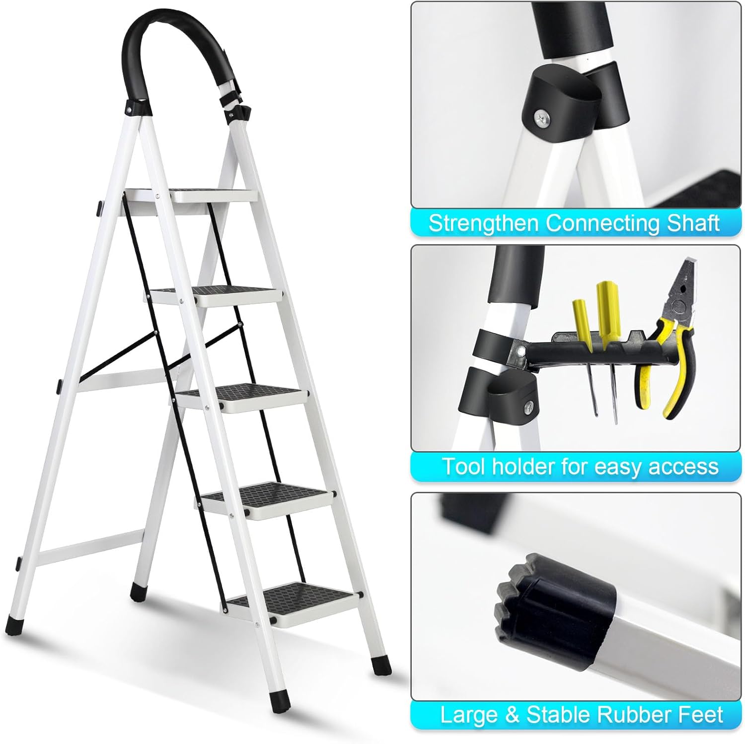 • SECURITY& STABILITY UPGRADE: 6 step foldable ladder added metal support and thickened the steel frame, and used safety lock design to fix the ladder. When you use it, simply push down the top pedal until the safety locking mechanism is automatically locked in place. Rust-resistant steel frame with safety locking mechanism, strong and reliable structure