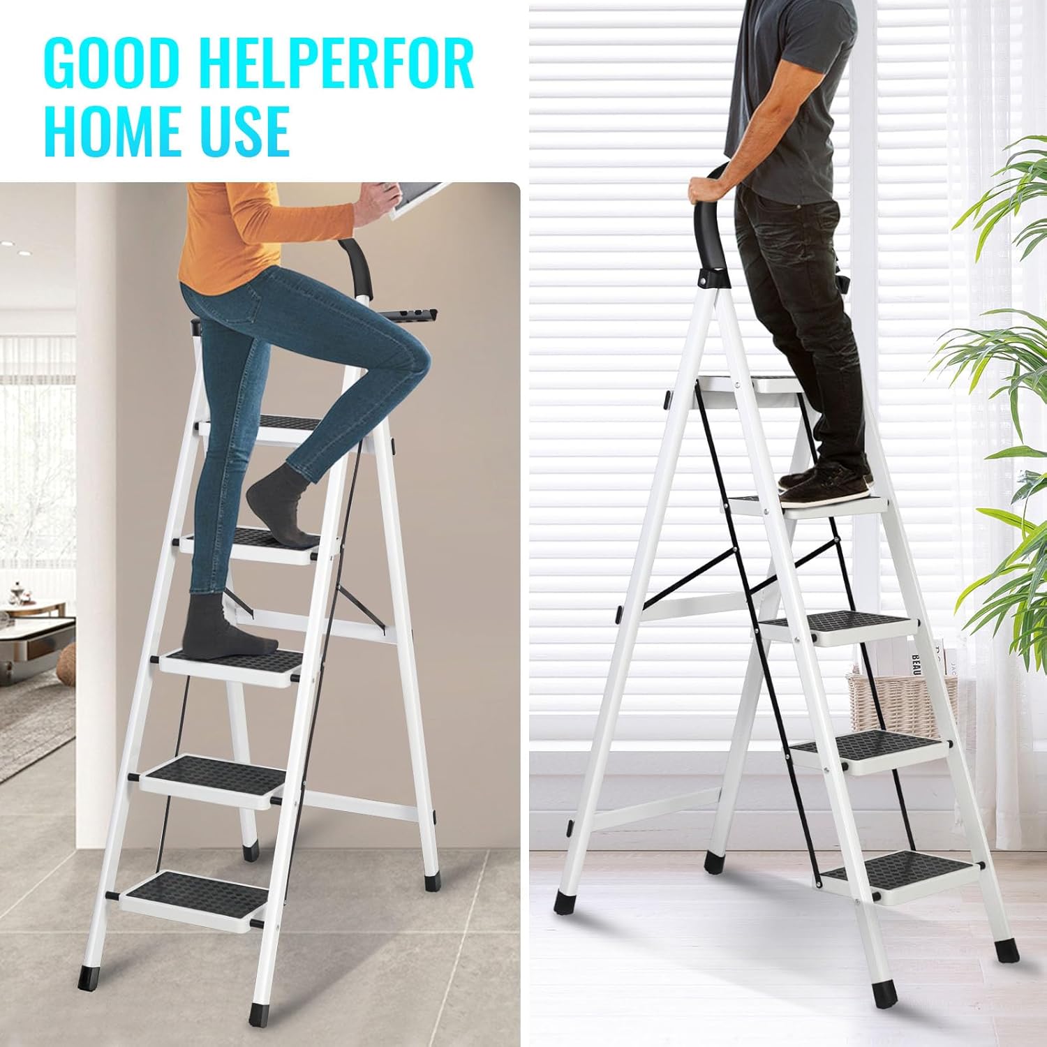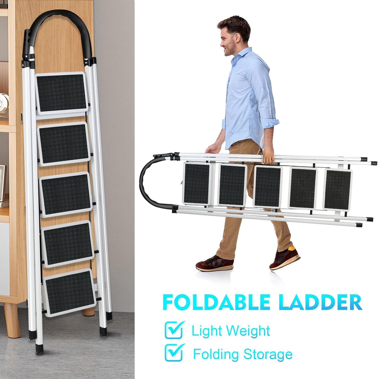• EASY STORAGE: Our ladder can be simply folded and stored away. Its compact, lightweight design makes it easy to move and put away. easy to carry for both indoor and outdoor. Can be hidden away in any kitchen cupboard or closet. The step ladder comes pre-assembled.