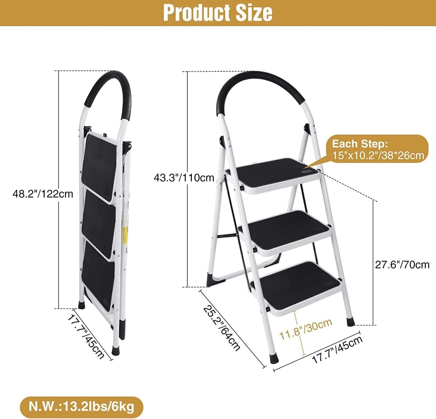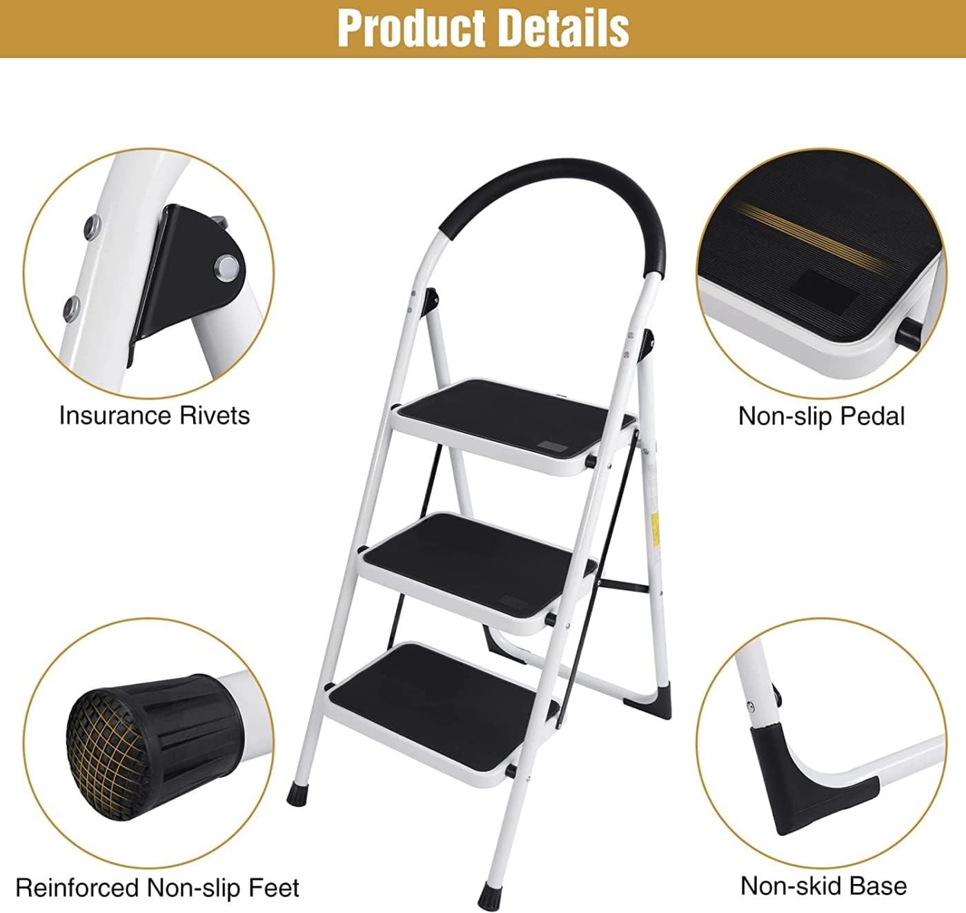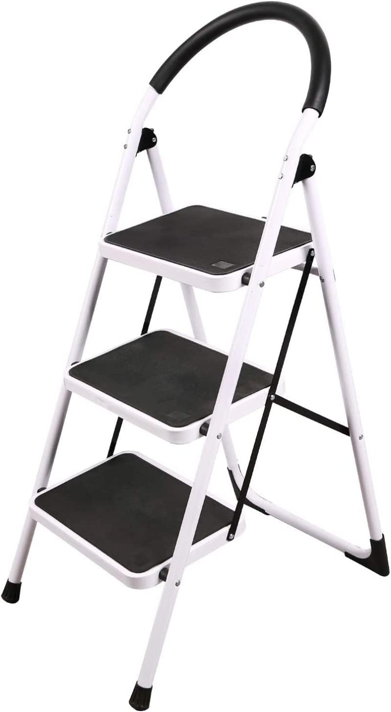 - SECURITY& STABILITY UPGRADE: 3 step foldable ladder added metal support and thickened the steel frame, and used safety lock design to fix the ladder. When you use it, simply push down the top pedal until the safety locking mechanism is automatically locked in place. Rust-resistant steel frame with safety locking mechanism, strong and reliable structure.