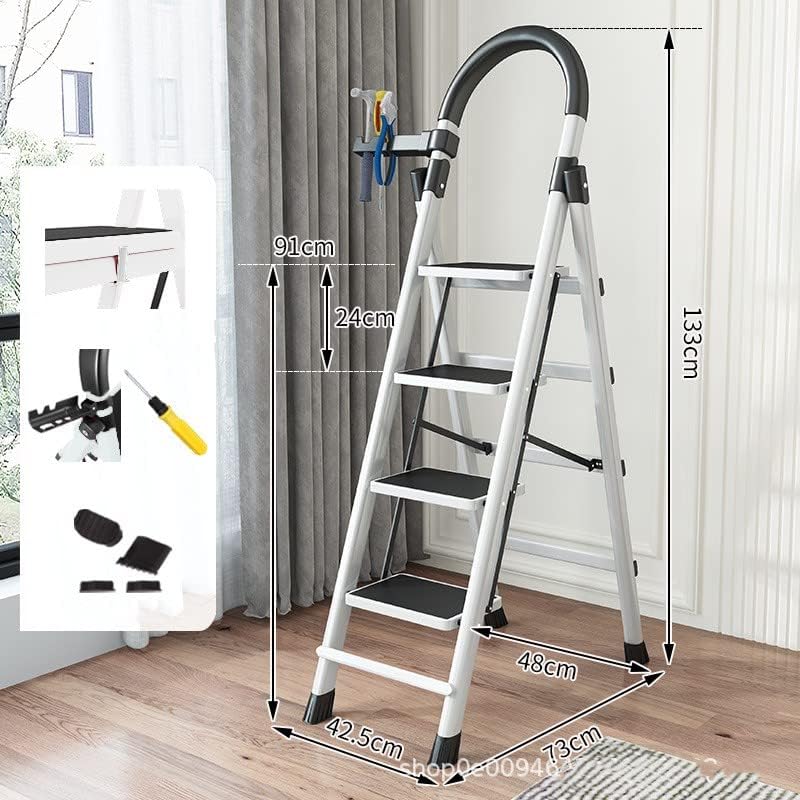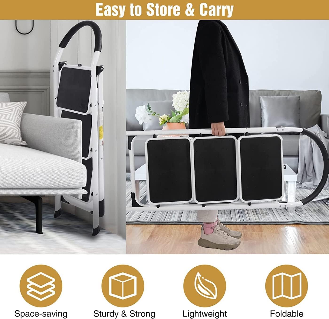 - EASY STORAGE: Our ladder can be simply folded and stored away. Its compact, lightweight design makes it easy to move and put away. easy to carry for both indoor and outdoor. Can be hidden away in any kitchen cupboard or closet. The step ladder comes pre-assembled.