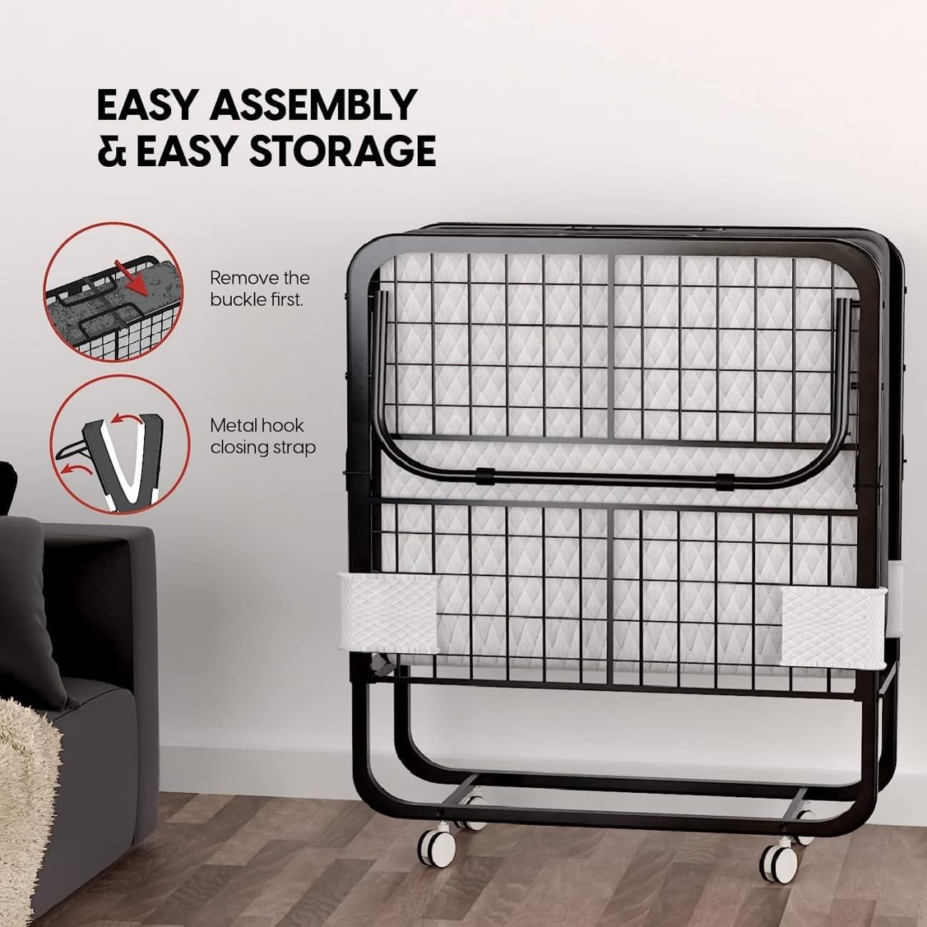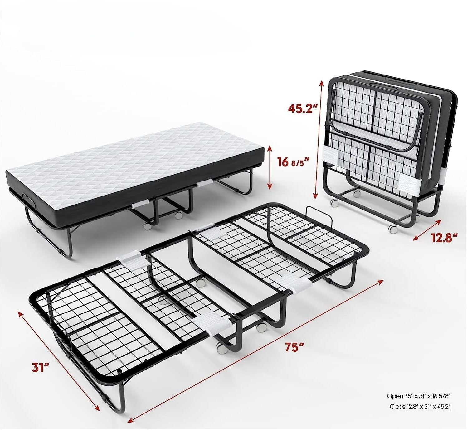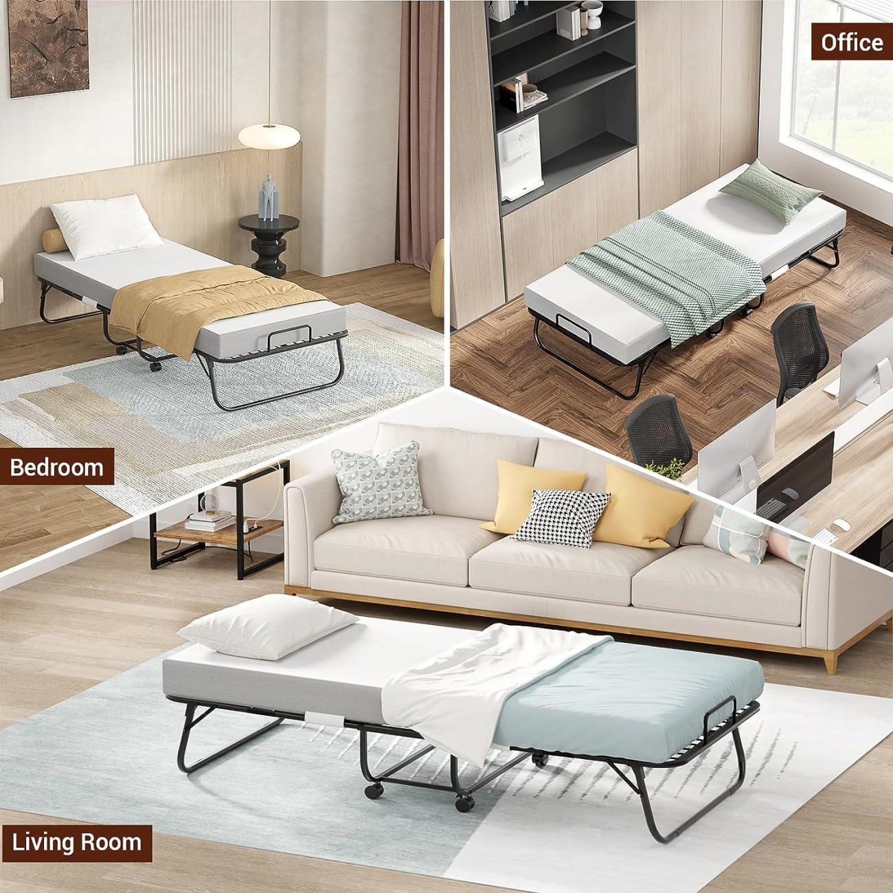 - MULTIPURPOSE FOLDING BED - rollaway bed with mattress is great as a convenient extra guest bed when your friends and family come to visit, or as a daybed in the living room, or as a comfy camping bed during vacation or nap bed in the office. Foldable design that is easy to transport and store away when not in use.