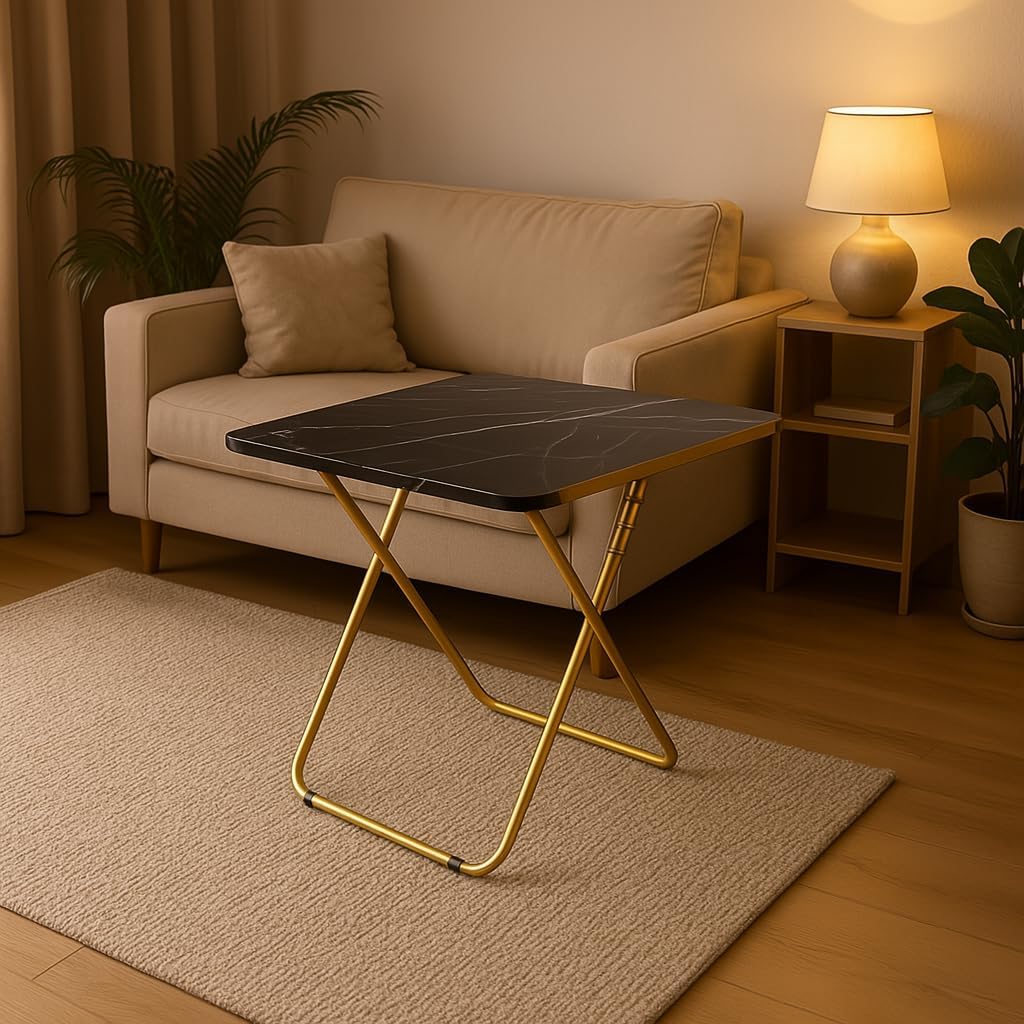 - Elegant & Durable Construction: Features a high-quality black marble-look wood surface with a strong gold-tone metal frame. The X-shaped base ensures stability