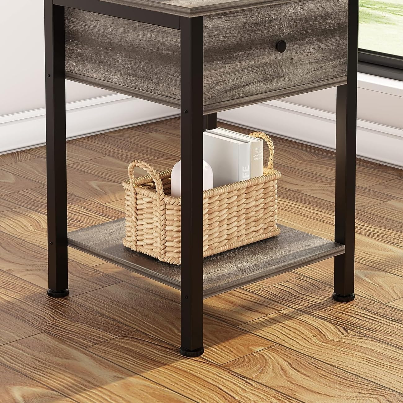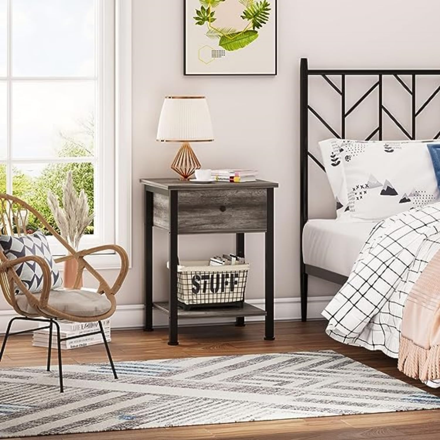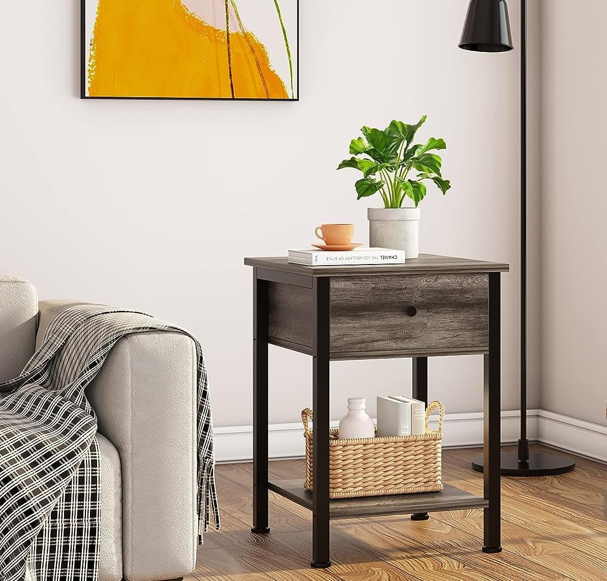 SKY-TOUCH Nightstand Table with Drawer, Bedside Table Wood Night Stand Modern End Table Side Table for Bedroom and Living Room, Sturdy Steel Frame, Easy Assembly, Grey
