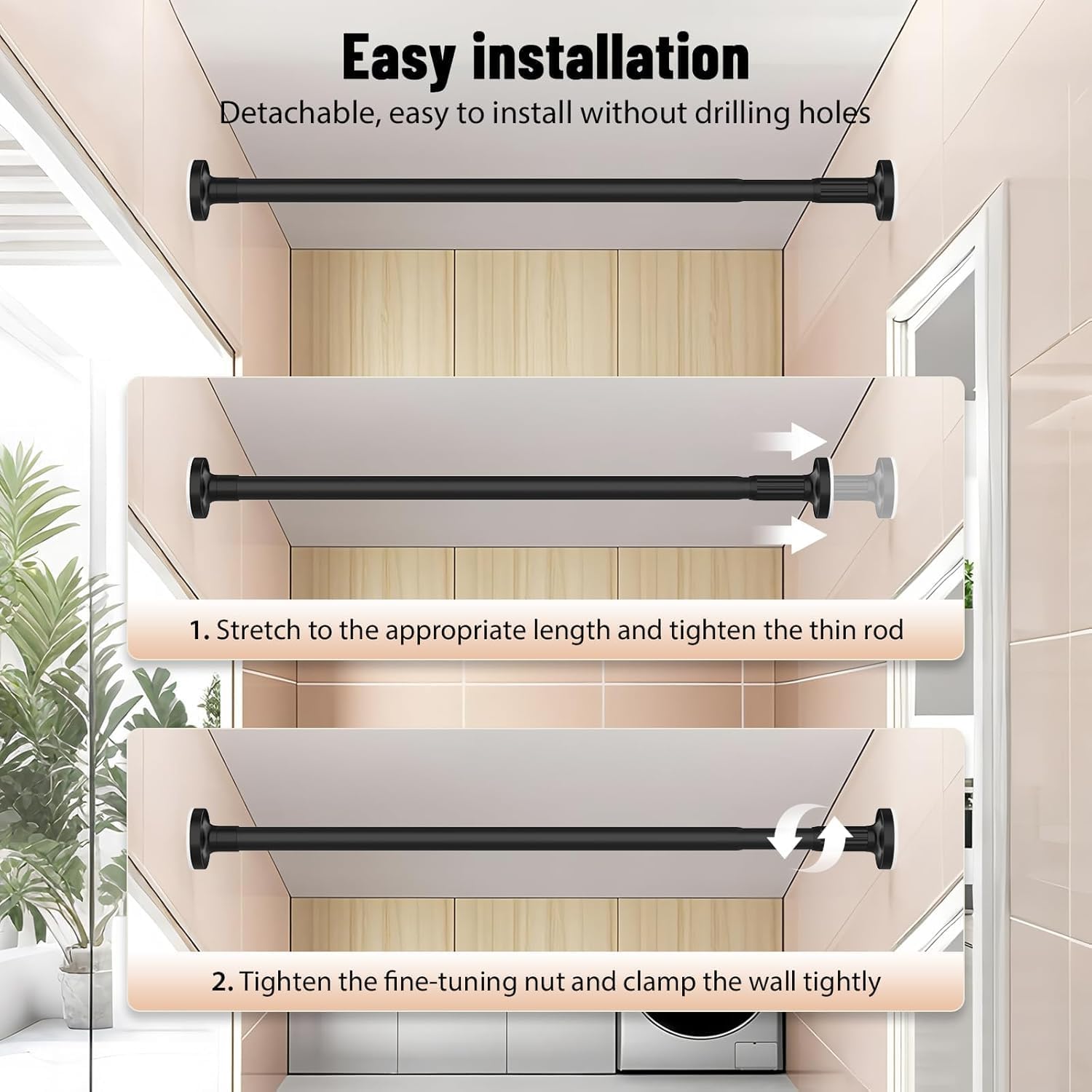 - Durable & Rust-Resistant Stainless Steel Construction: Crafted from high-quality carbon steel, this adjustable curtain pole is built to last. It resists rust and corrosion, making it ideal for humid environments like bathrooms (shower curtains) or kitchens. The sturdy tension curtain rod ensures reliable support without bending or sagging.