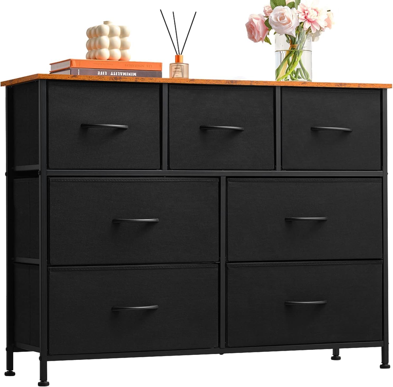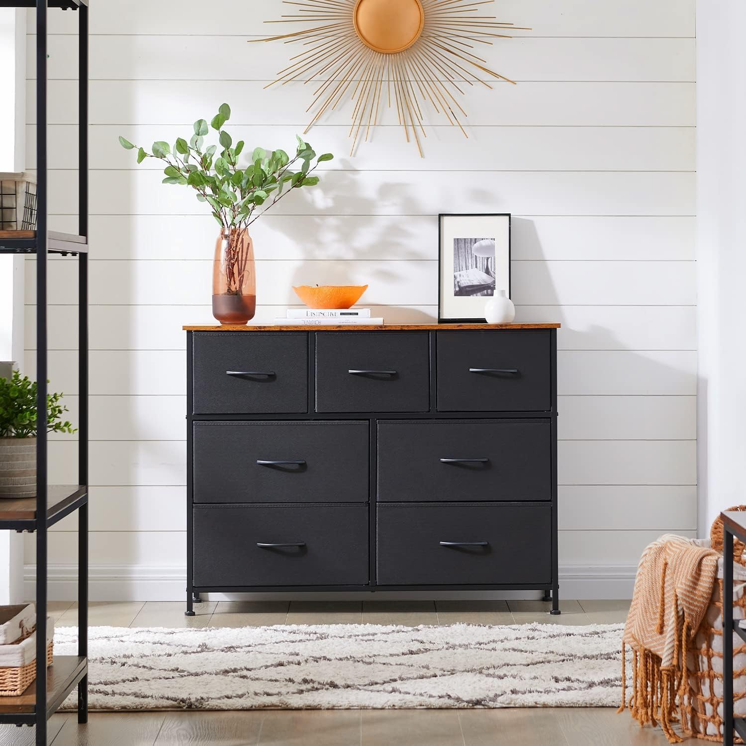 SKY-TOUCH Storage Cabinet : Bedroom Dresser with 7 Drawers Wide Storage Chest with Removable Fabric Bins Storage Organizer Unit for Living Room Entryway Hallway Nursery Kids Room (100*30*74CM Black/Brown)