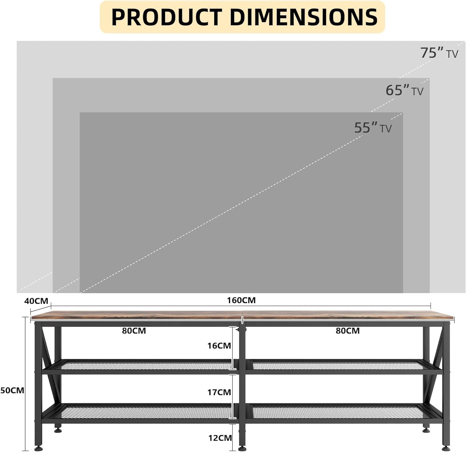 - Spacious and Sturdy Construction: Measuring 160CM(L) x 40CM(W) x 50CM(H), this TV stand can securely hold up to a 65-inch TV. The reinforced frame on both sides enhances stability and durability. Constructed with solid metal frames and MDF board, this TV stand is built for long-term use and can support a maximum load capacity of 68KG.