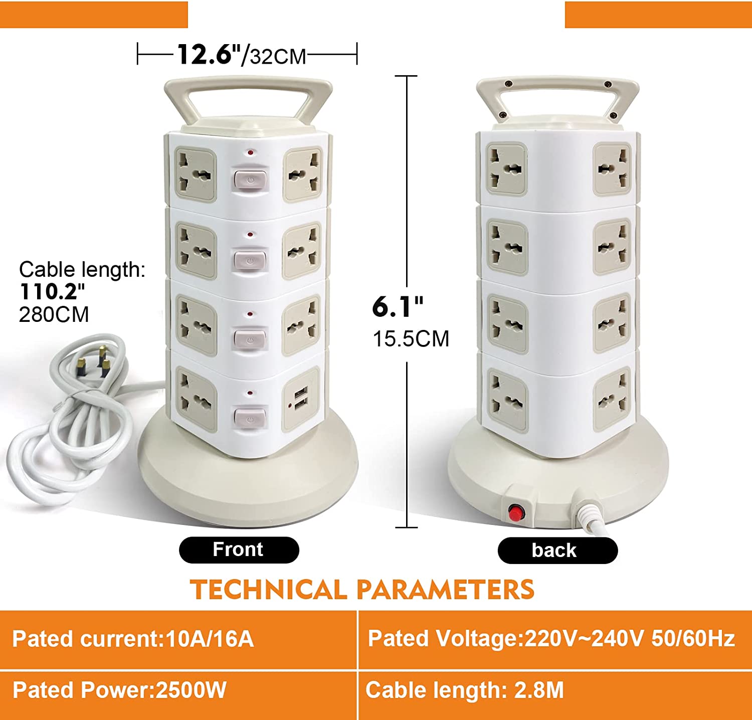 - Durable and reliable: vertical tower power strip made of high quality abs and pvc, reliable and durable, flame resistant. the 2500w rated power copper cable allows all 14 plugs and 2 USB ports to operate simultaneously without interruption. the built-in intelligent surge control protector will automatically turn off the power to protect the connected device.