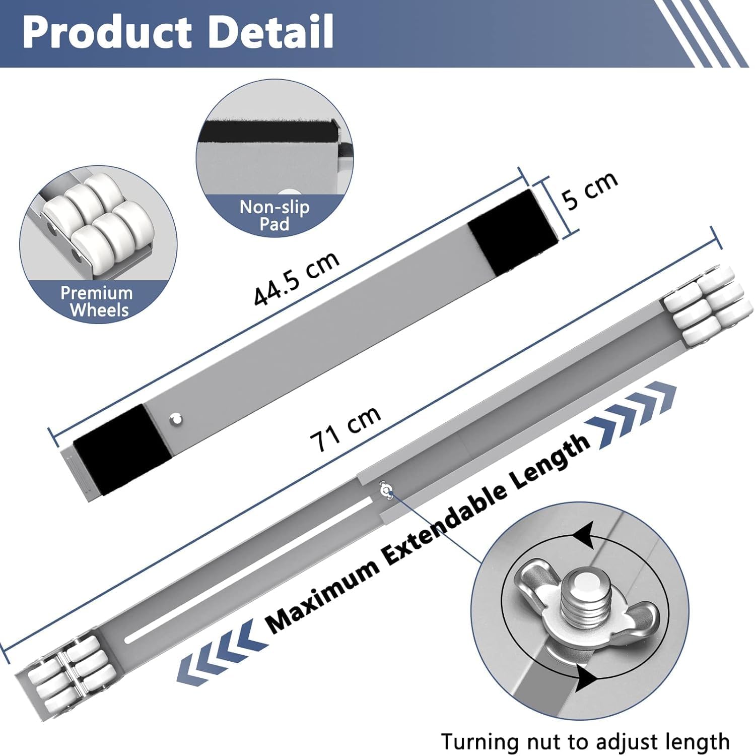 - Adjustable Size: The appliance dolly is extendable from 45 cm to 70 cm to compatible with various furniture sizes. There is a knob at the bottom of this washing machine stand so you can adjust the length to hold items as you need.